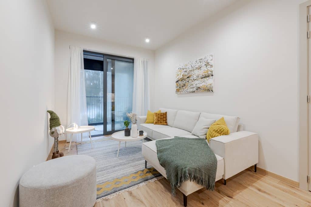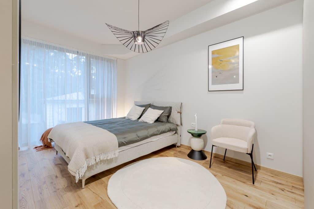 Interjeros dominē gaiši, silti toņi, ozolkoka parkets un kvalitatīvas flīzes, radot mierīgu skandināvisku noskaņu. Minimālistiska bāze ļauj jaunajiem īpašniekiem viegli pielāgot telpas savai gaumei – no modernā minimālisma līdz izteiksmīgākiem akcentiem. Panorāmas logi ar trīskāršo stiklojumu un siltināti alumīnija rāmji nodrošina gan energoefektivitāti, gan maksimāli daudz dabīgās dienas gaismas.
