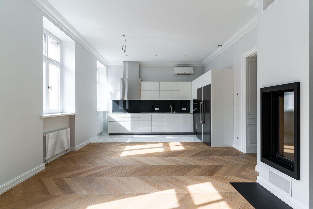 All apartments have restored or installed wood fireplaces, smart home system, soundproof oak windows and hardwood oak parquet. Great attention was paid to noise insulation, safety and comfort of the prospective inhabitants of the house. All apartments are fully finished, equipped with German quality kitchen appliances from Leicht, Kuppersbuch, Miele. Five apartments are fully furnished. In total there are 21 apartments located on the second to the sixth floor, with living area from 65 to 145 m2, including 3 two-level apartments. In the basement there are storage rooms (3-9 m2) for each apartment of the building, as well as house maintenance rooms. The building also has an automated, multi-storey car park for 8 cars and a closed courtyard.