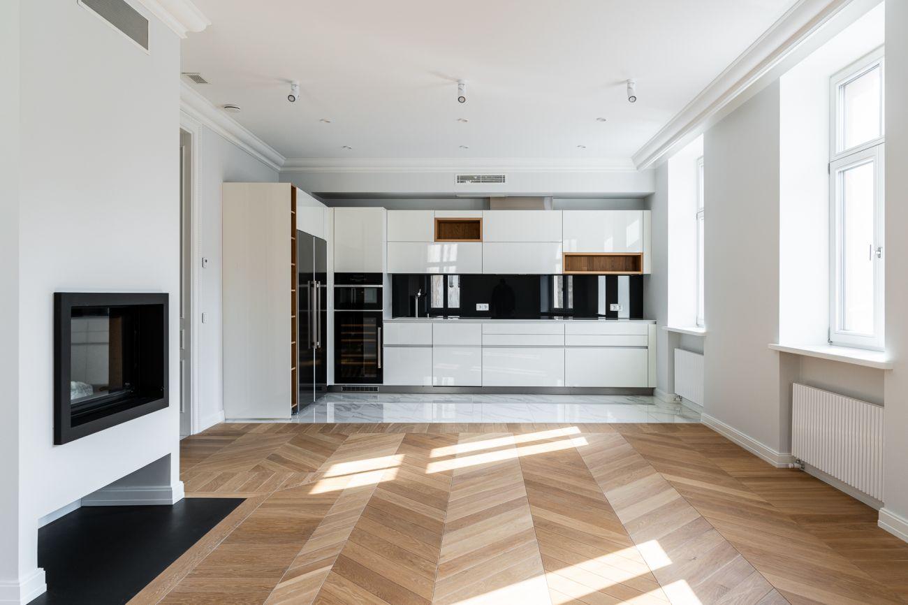 All apartments have restored or installed wood fireplaces, smart home system, soundproof oak windows and hardwood oak parquet. Great attention was paid to noise insulation, safety and comfort of the prospective inhabitants of the house. All apartments are fully finished, equipped with German quality kitchen appliances from Leicht, Kuppersbuch, Miele. Five apartments are fully furnished. In total there are 21 apartments located on the second to the sixth floor, with living area from 65 to 145 m2, including 3 two-level apartments. In the basement there are storage rooms (3-9 m2) for each apartment of the building, as well as house maintenance rooms. The building also has an automated, multi-storey car park for 8 cars and a closed courtyard.
