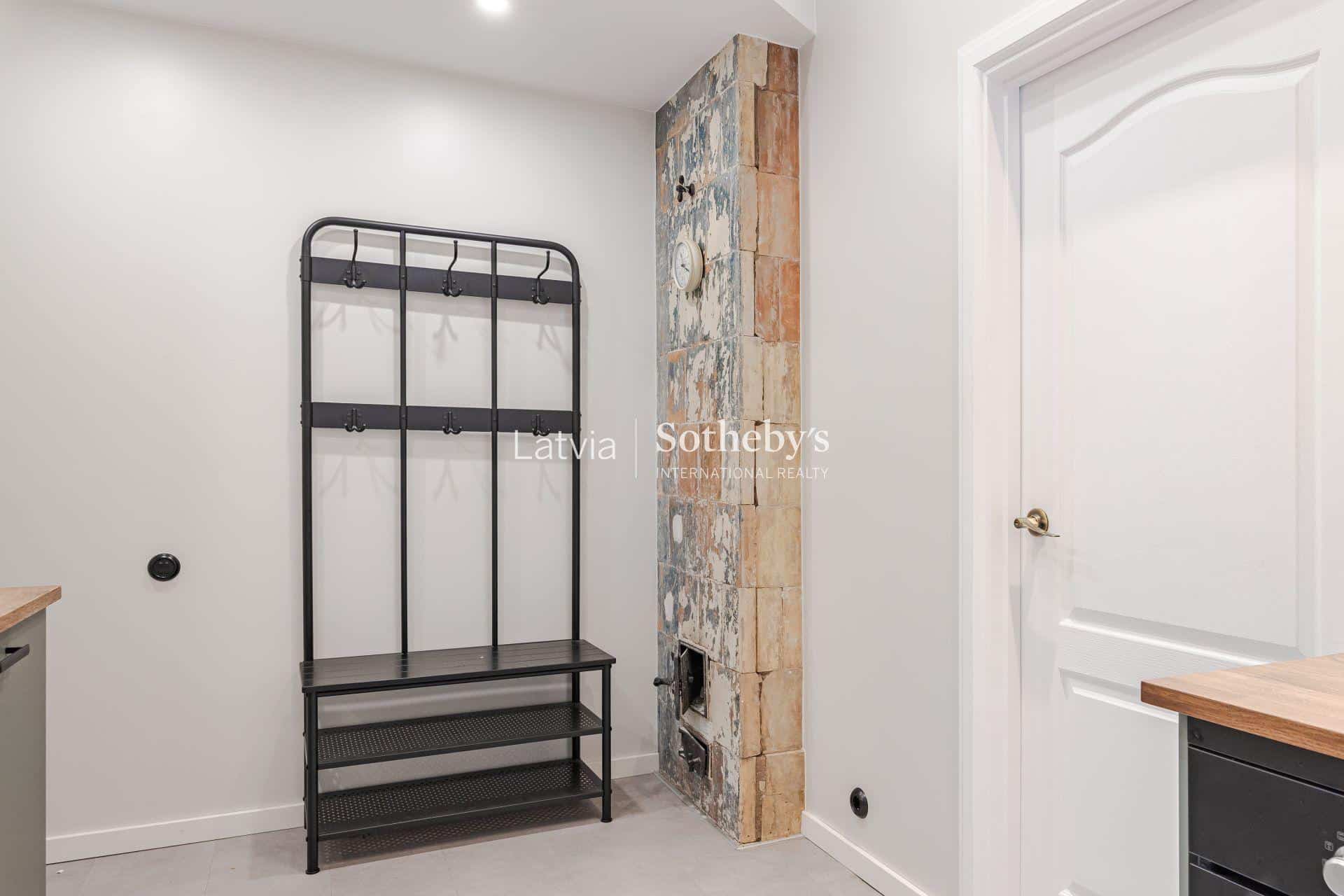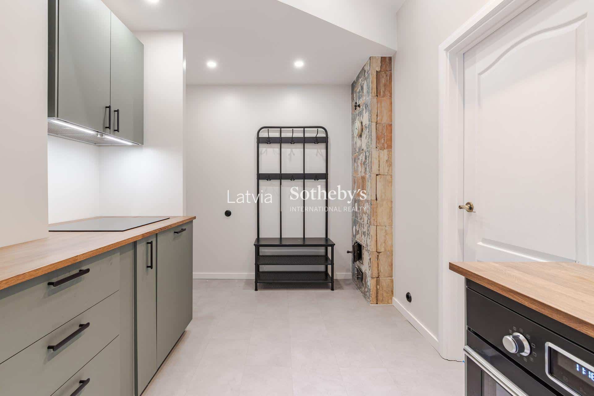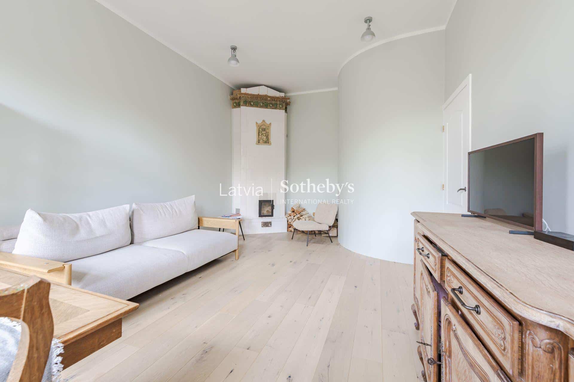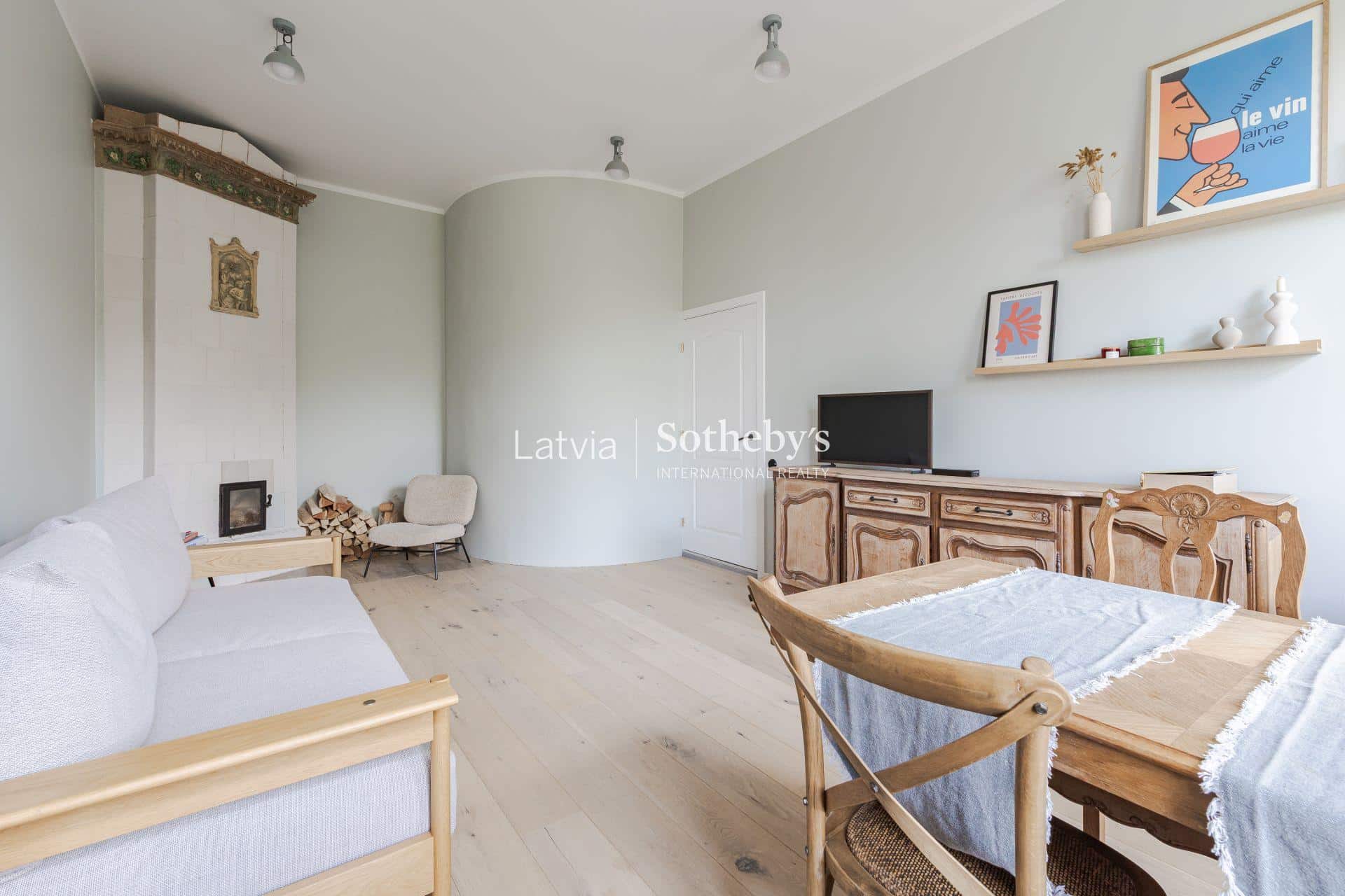 The layout of the apartment offers an entrance area, a small and cozy kitchen, a living room with an antique fireplace and a beautiful view of the park from the window, a small bathroom with shower and toilet, one bedroom and a walk-in wardrobe. All communications, electric heating.