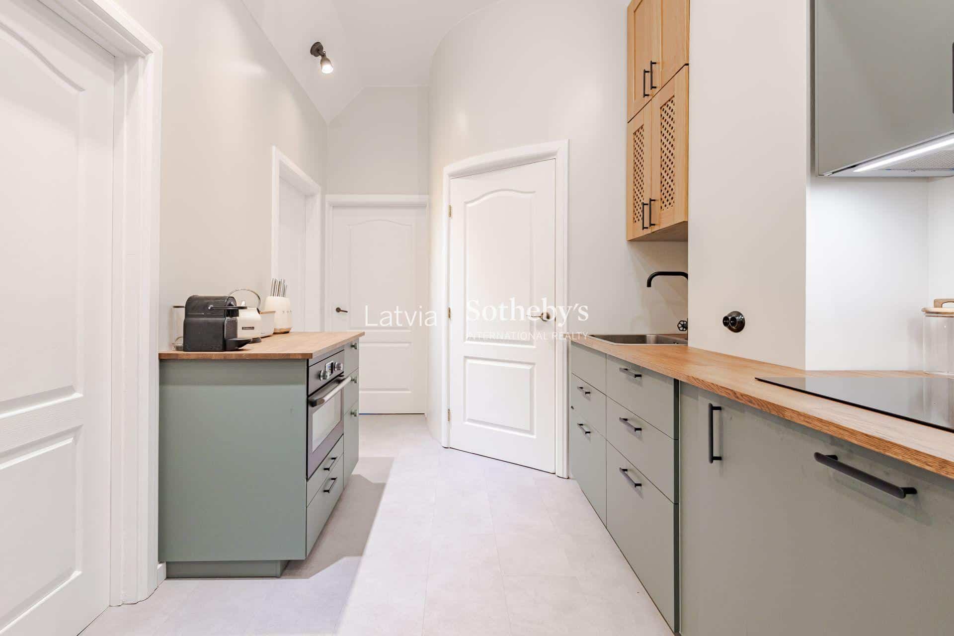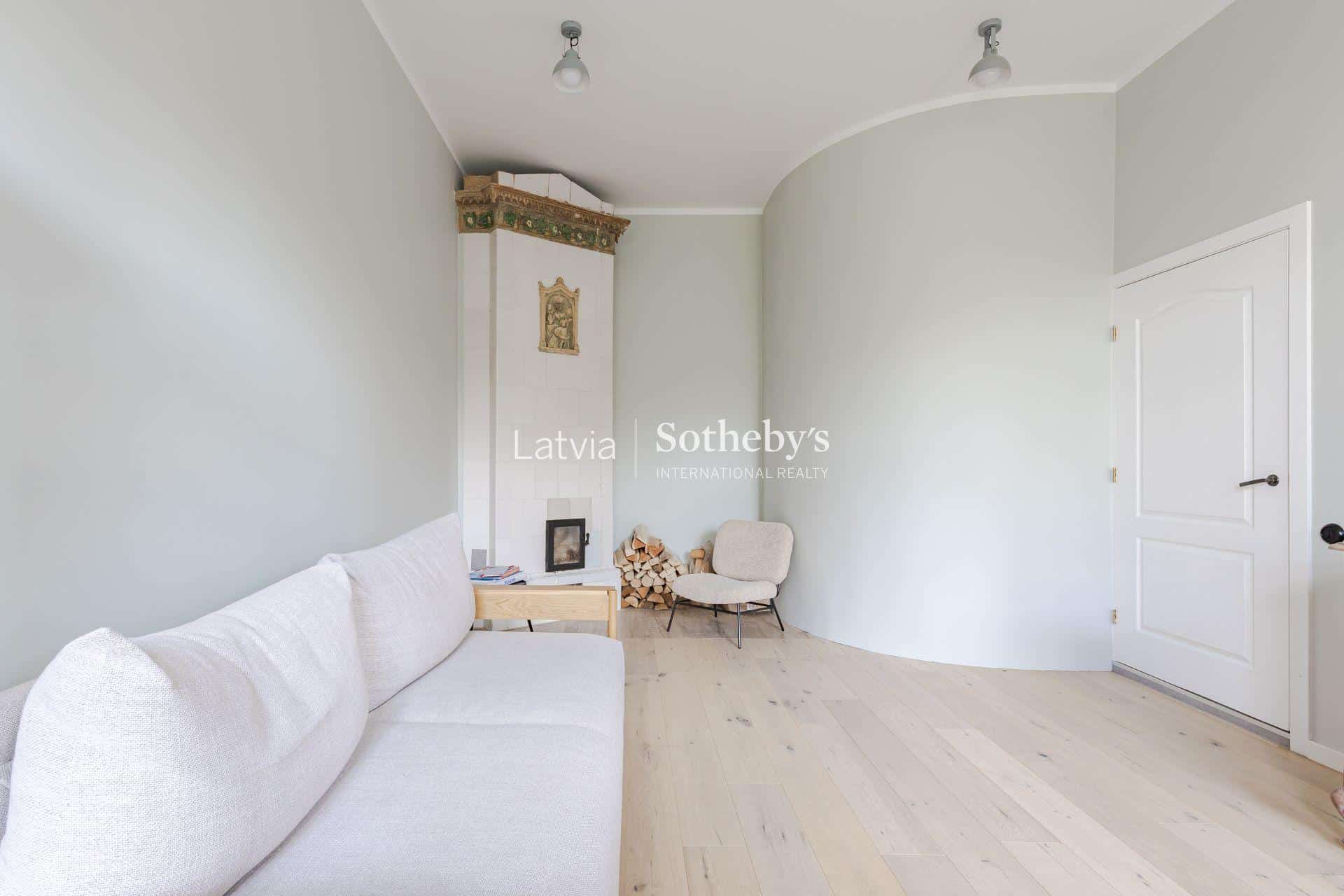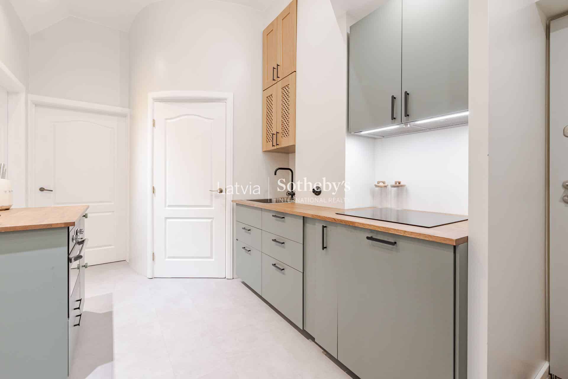The layout of the apartment offers an entrance area, a small and cozy kitchen, a living room with an antique fireplace and a beautiful view of the park from the window, a small bathroom with shower and toilet, one bedroom and a walk-in wardrobe. All communications, electric heating.