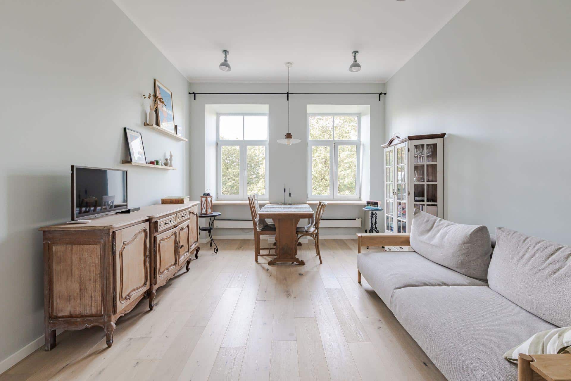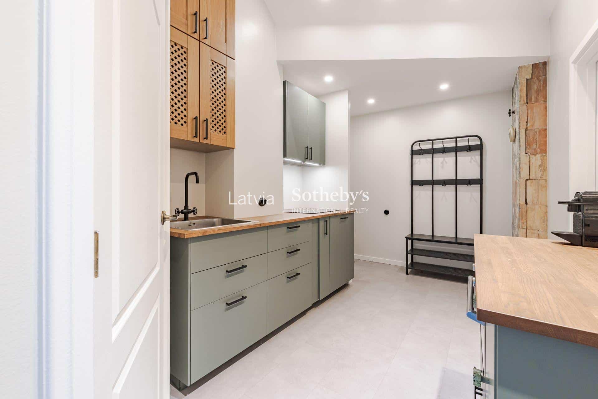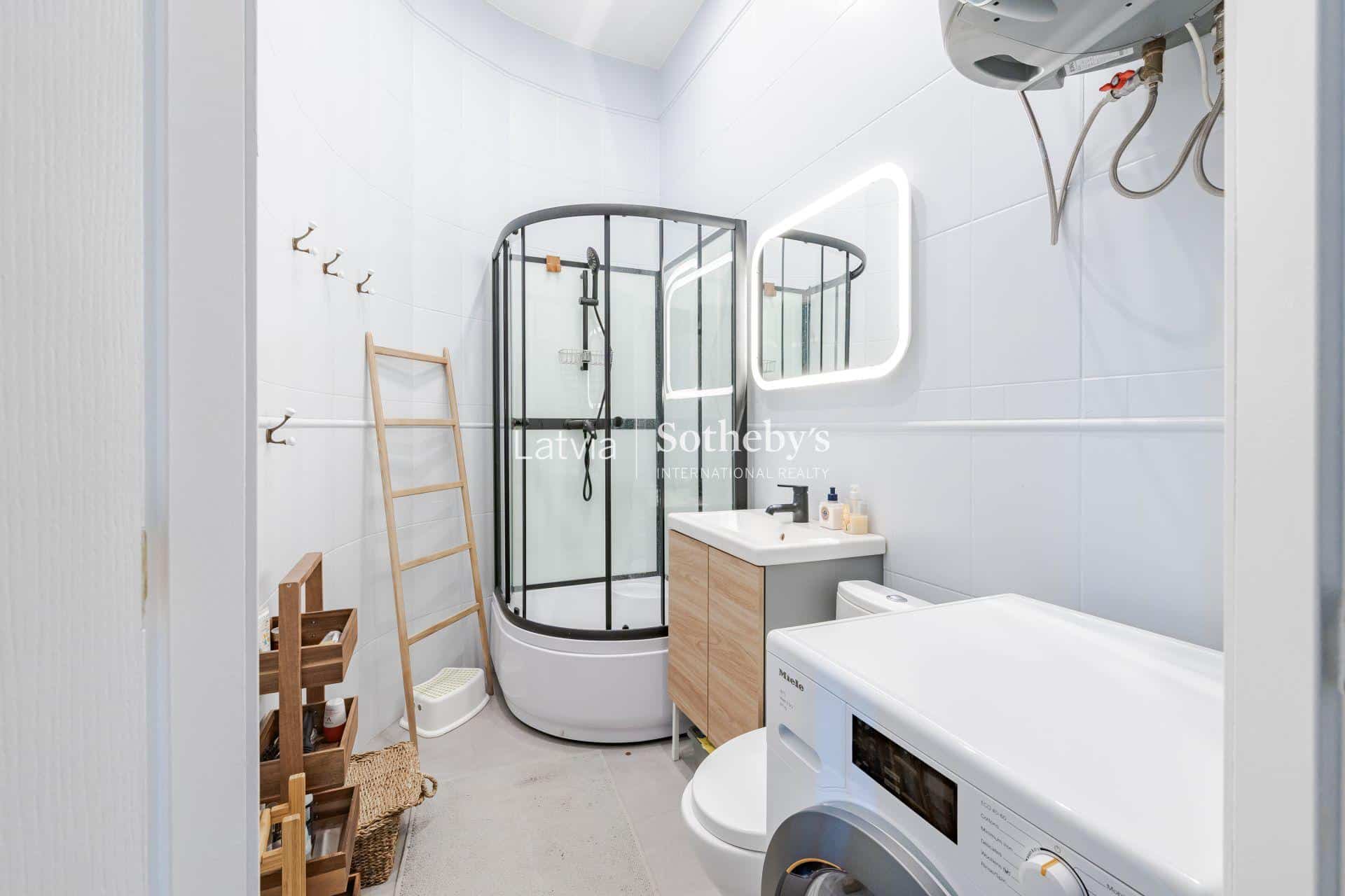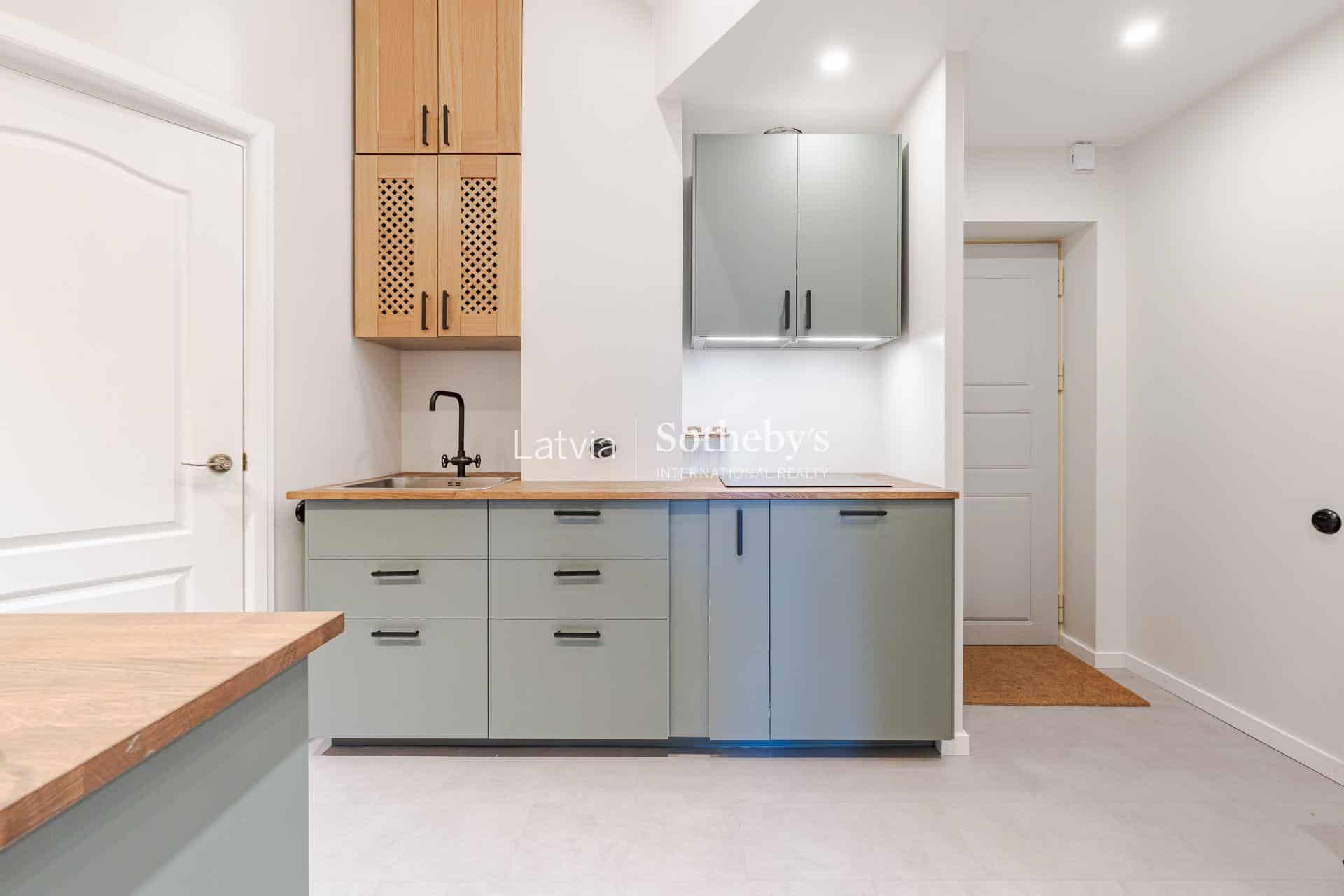 The layout of the apartment offers an entrance area, a small and cozy kitchen, a living room with an antique fireplace and a beautiful view of the park from the window, a small bathroom with shower and toilet, one bedroom and a walk-in wardrobe. All communications, electric heating.