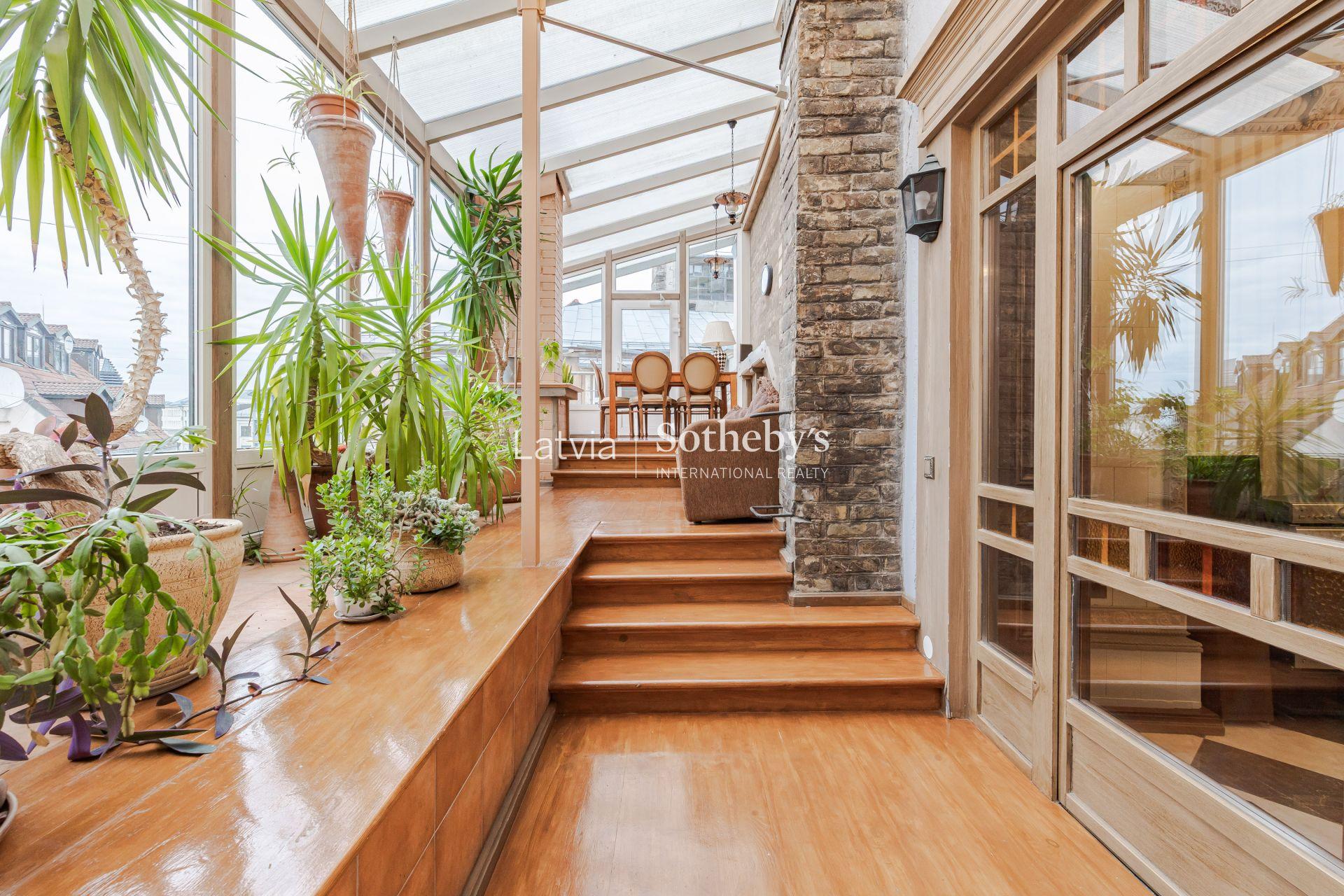 The apartment features a thoughtfully designed layout: a spacious living room with a fireplace, a separate TV area, a kitchen zone with built-in appliances, a winter garden with a balcony offering beautiful views over the rooftops of Old Riga, two isolated bedrooms with private bathrooms, a study or third bedroom with a fireplace, as well as a guest bathroom and a walk-in wardrobe.