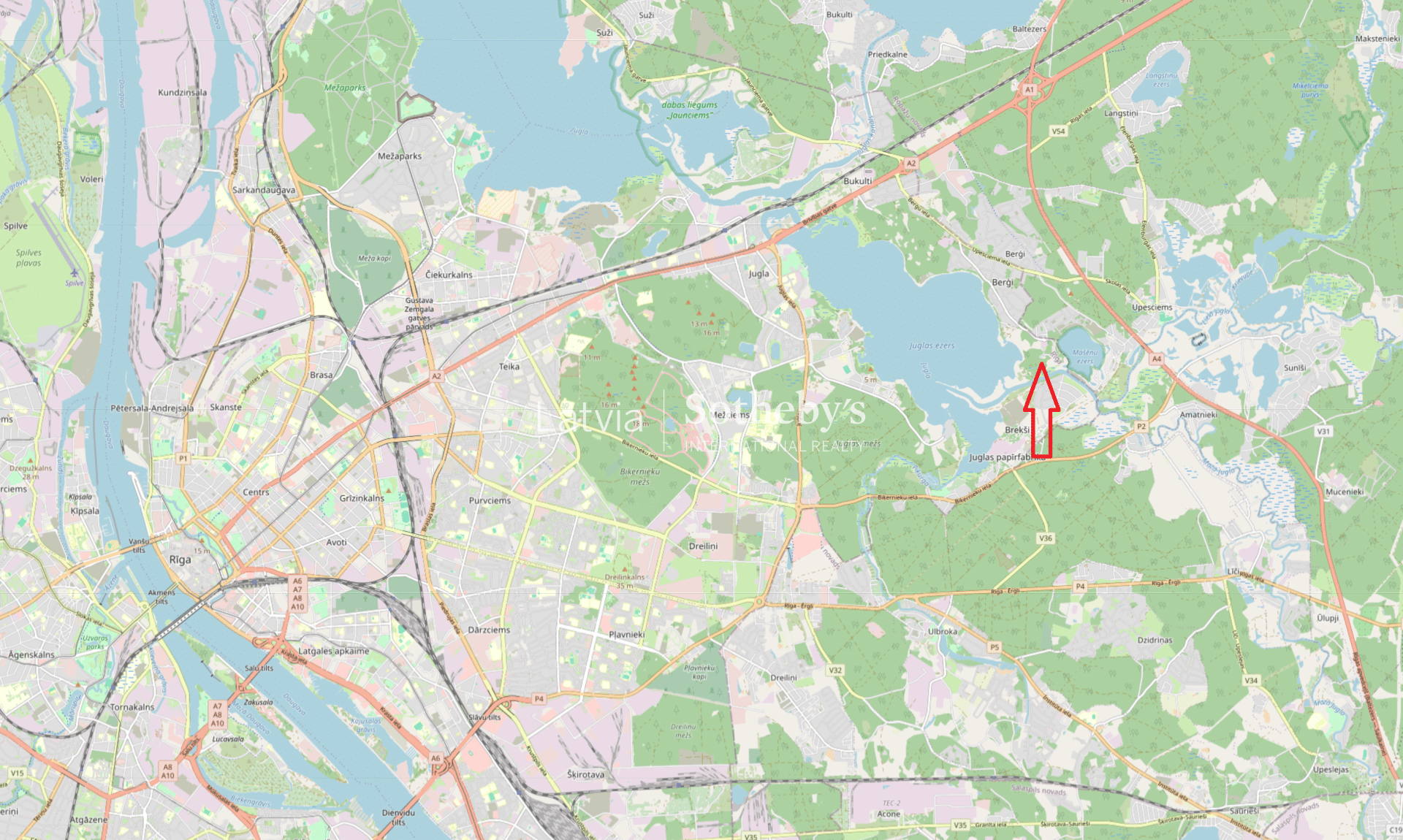 In Berģi, within the administrative boundaries of Riga, a 19.32 ha development site is offered with an approved detailed plan. The property features pronounced topography, an extensive forested area, and a long waterfront stretch along Lake Jugla and the Jugla River, enabling the creation of a residential environment with a distinct “nature resort” feel in everyday life. The Riga city centre is approximately ~15 km away via Brīvības iela or ~23 km via Biķernieku iela, providing a balanced combination of privacy and proximity to urban infrastructure.
