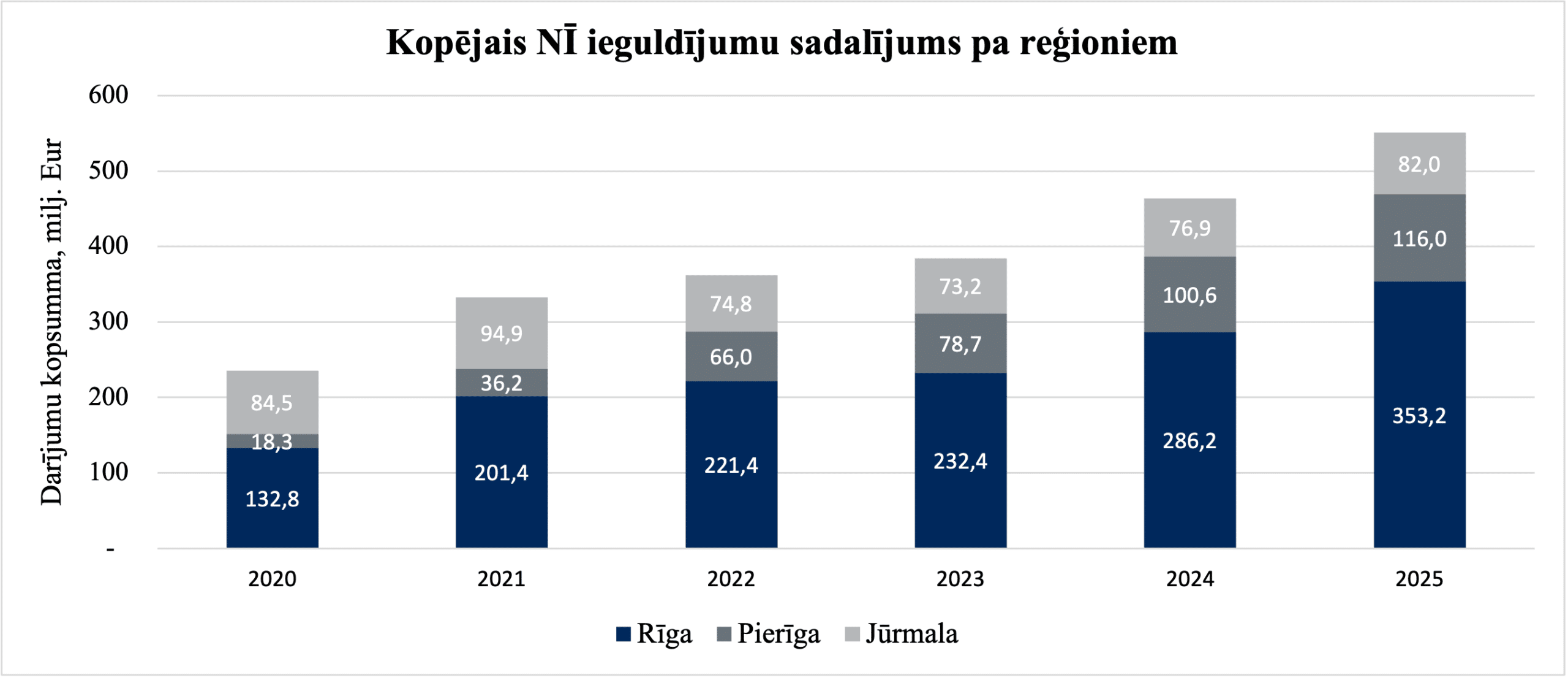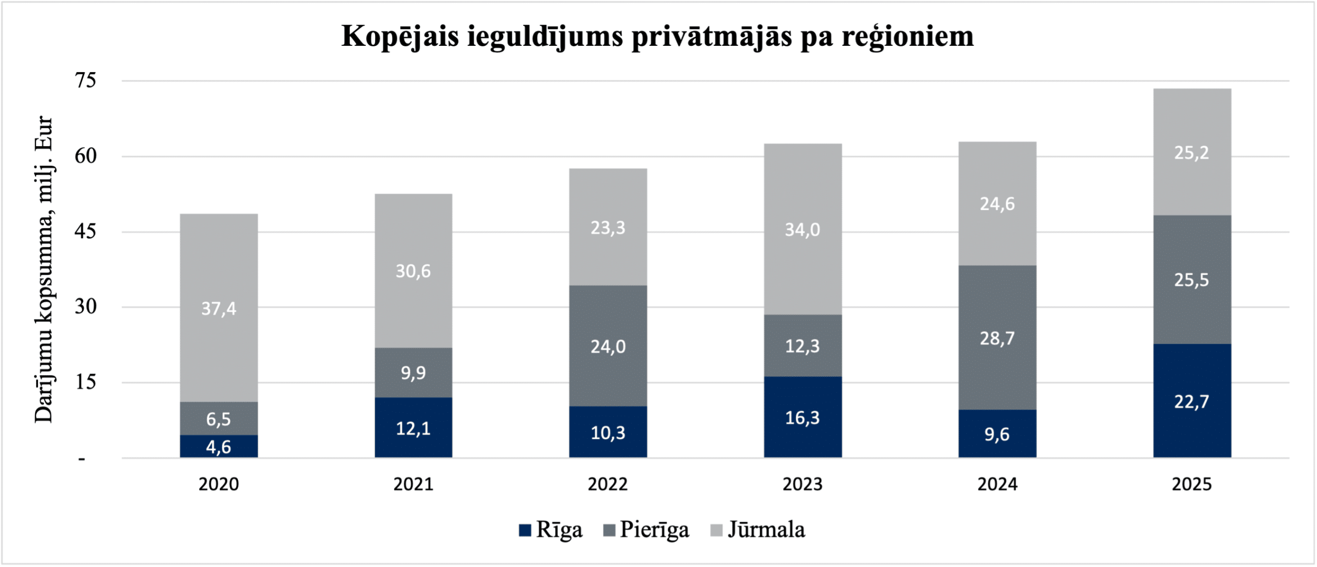 2025. gadā ir bijis diezgan vienāds tirgus daļas sadalījums starp 3 reģioniem. Lai gan darījumu skaits ievērojami lielāks ir bijis Pierīgā (53) salīdzinoši ar Rīgu un Jūrmalu, respektīvi 31 un 29, tomēr kopsummā Pierīga izraujas tikai par pāris tūkstošiem salīdzinājumā ar Jūrmalu. Pierīga ir spējusi piesaistīt 25,5 milijonus eiro, toties Jūrmala 25,1 milijonus eiro un Rīga 22,7 milijonus eiro.