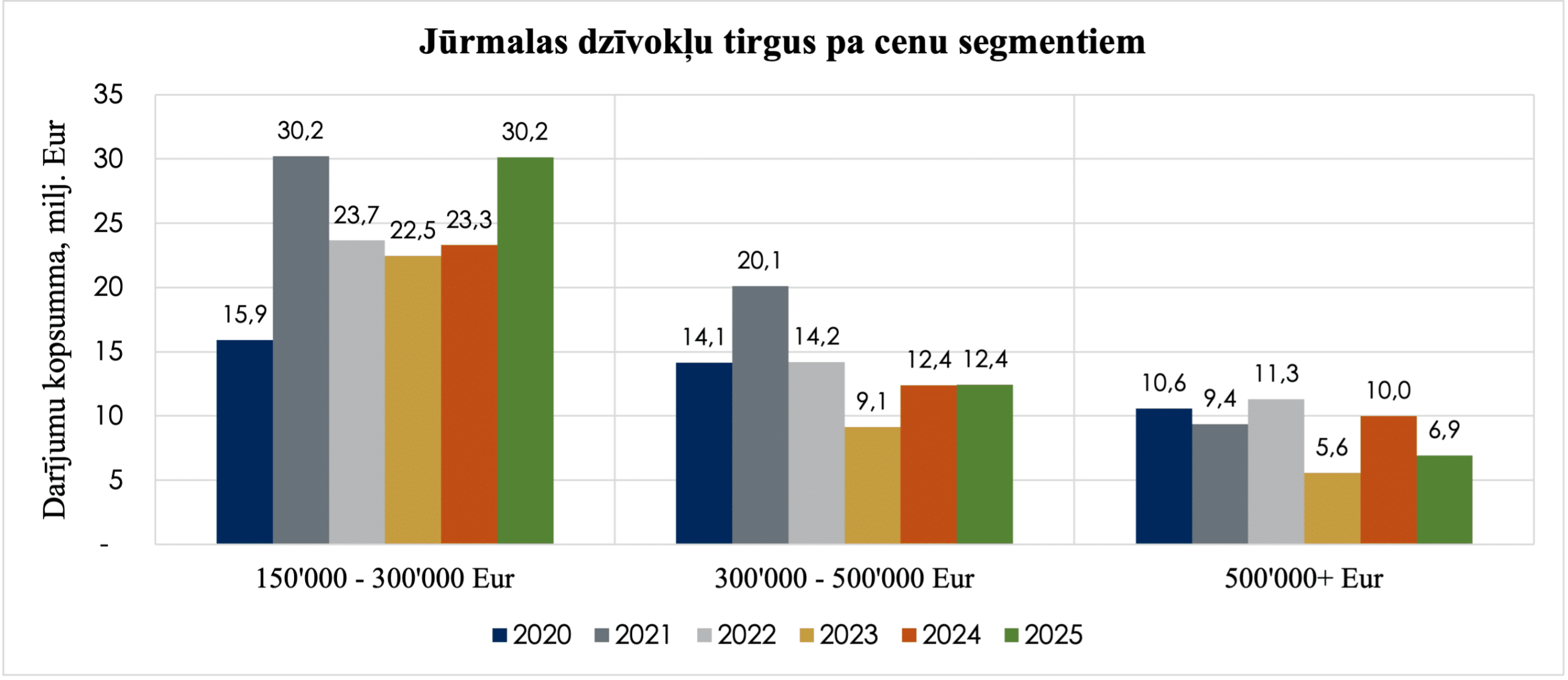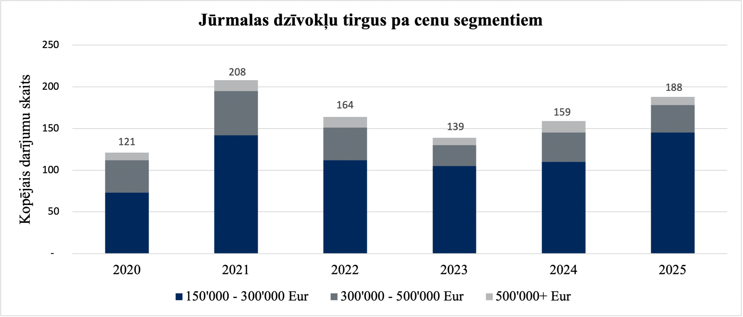 Jūrmala 2025. gadā turpina iezīmēt savu unikālo lomu premium dzīvokļu tirgū kā nišas, taču augstas vērtības segments. Reģionā tika noslēgti 188 darījumi (+18% salīdzinot ar 2024. gadu) ar kopējo summu 49,5 miljoni eiro (+8% salīdzinot ar 2024. gadu). Atšķirībā no Rīgas un Pierīgas, būtisku tirgus daļu Jūrmalā veidoja darījumi augstākajos cenu segmentos virs 300 000 eiro, atspoguļojot pircēju izteiktu orientāciju uz ekskluzivitāti, atrašanās vietu pie jūras un ierobežotu augstvērtīga piedāvājuma apjomu.