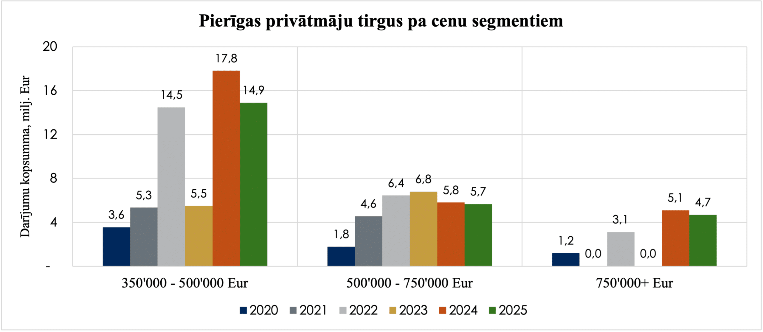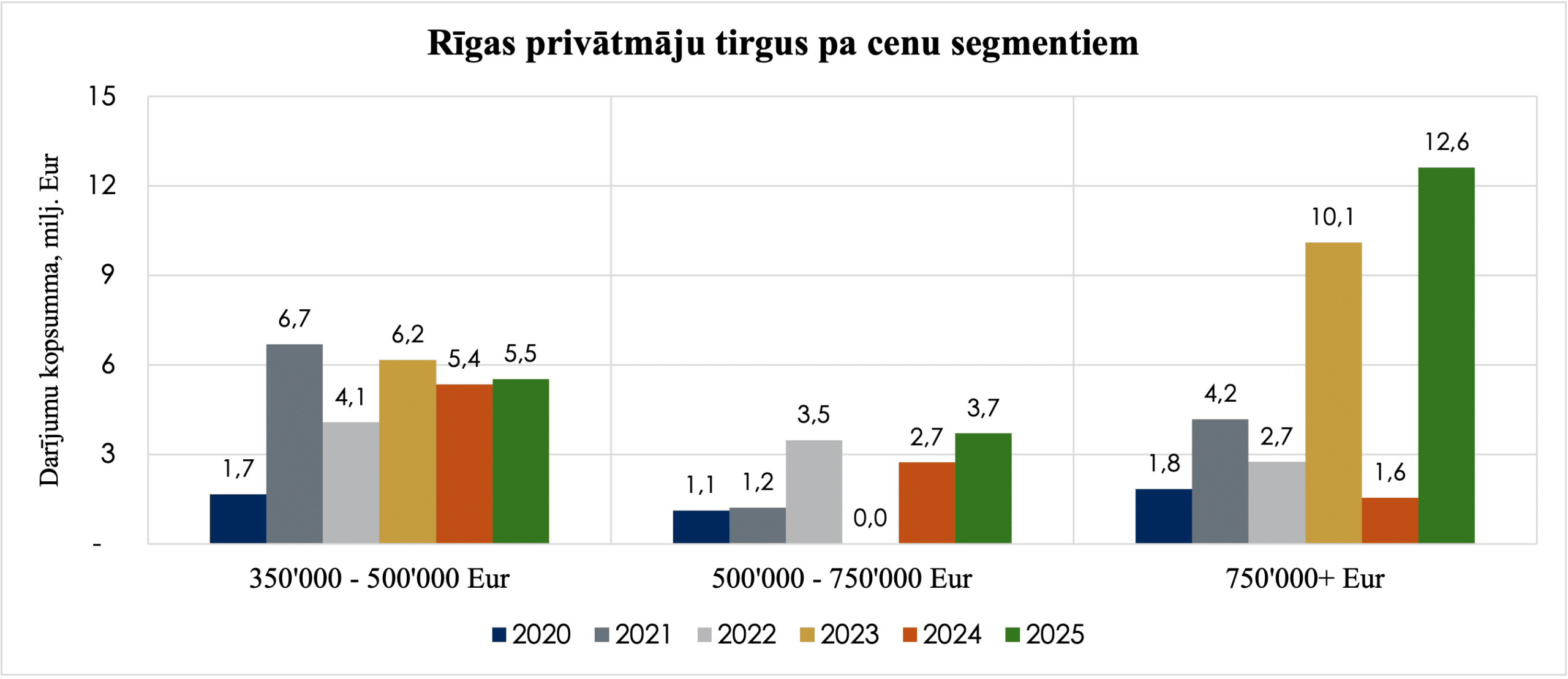 Rīgā privātmāju tirgus 2025. gadā bija salīdzinoši labs pēc darījumu skaita, kā arī izcēlās ar augstu vidējo darījuma vērtību. Galvaspilsētā tika noslēgts 31 darījums ar kopējo apjomu 22,7 miljoni eiro. Darījumi pārsvarā koncentrējās cenu segmentā no 350 000 līdz 500 000 eiro, vienlaikus tieši darījumi virs 750 000 eiro sniedza nozīmīgāko ieguldījumu kopējā apjomā, 2025. gadā sasniedzot augstāko līmeni visā analizētajā periodā.