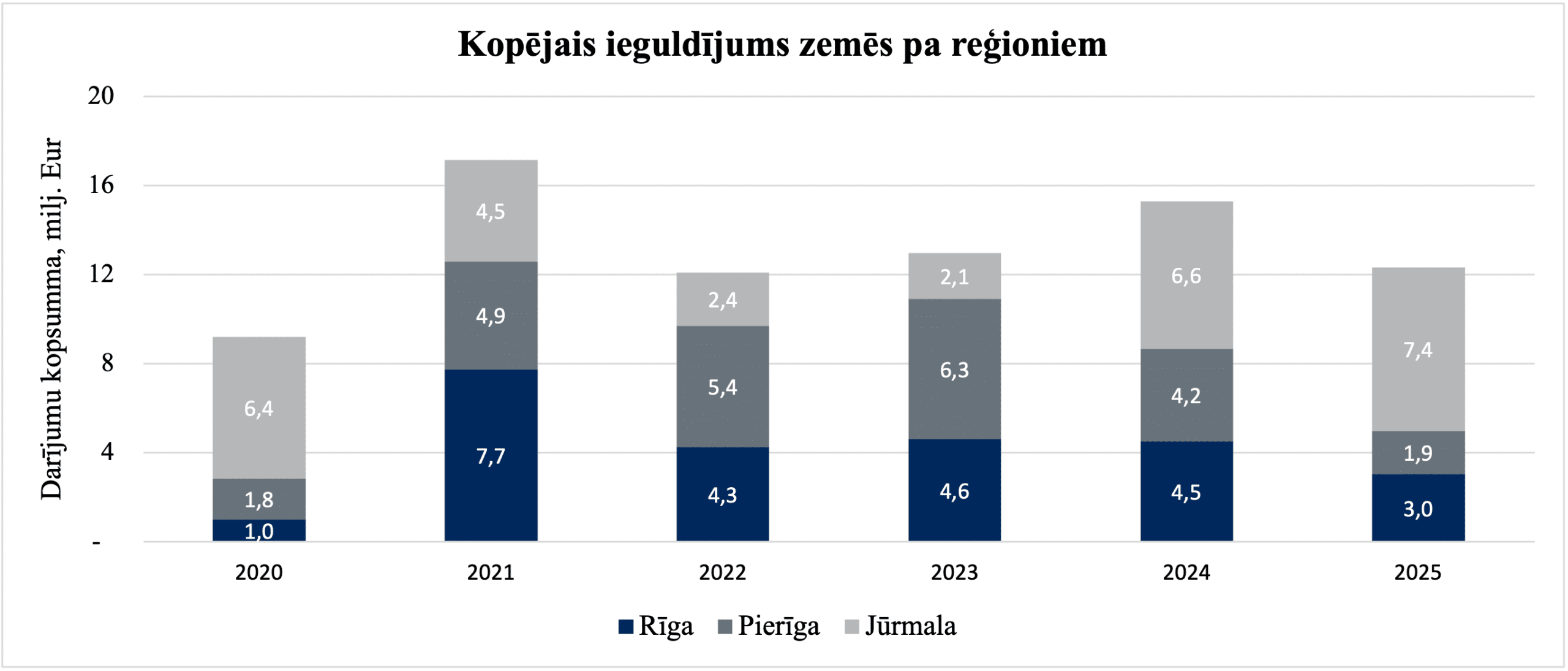 Zemes segmenta ieguldījumu sadalījums starp reģioniem ir izteikti nevienmērīgs un svārstīgs, jo kopējos apjomus būtiski ietekmē neliels skaits liela apjoma darījumu, kas katru gadu var mainīt dominējošo reģionu. Zemes darījumu segments 2025. gadā Rīgā, Pierīgā un Jūrmalā raksturojās ar mērenu aktivitāti un izteikti selektīvu pircēju pieeju. Kopumā tika noslēgti 34 darījumi ar kopējo apjomu 12,3 miljoni eiro, kur dominējošo lomu ieņēma Jūrmala, veidojot vairāk nekā pusi no kopējās darījumu vērtības.