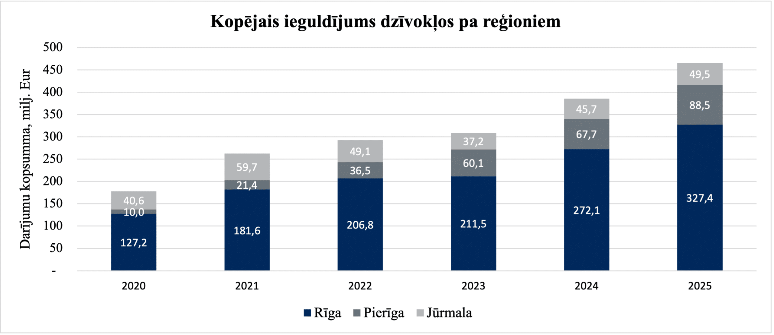 Reģionālajā griezumā Rīga nostiprināja savu vadošo lomu pēc darījumu apjoma, Pierīga izcēlās ar straujāko relatīvo izaugsmi un plašāku piedāvājumu ģimenēm orientētajā segmentā, savukārt Jūrmala saglabāja ekskluzīva tirgus statusu ar augstu darījumu vērtību un ierobežotu piedāvājumu.