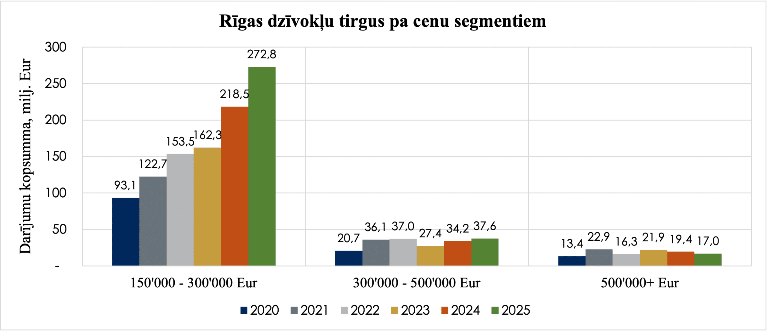 Rīgā, Pierīgā un Jūrmalā 2025. gadā kopumā tika noslēgti 2 163 dzīvokļu darījumi, sasniedzot kopējo darījumu summu 465,4 miljonu eiro(+21% kopš 2024.gada). Salīdzinājumā ar iepriekšējo gadu pieauga gan darījumu skaits (+25%), gan pārdoto kvadrātmetru apjoms (+17%), tomēr nevienmērīgi atspoguļojot pircēju pieprasījumu vai pirktspēju pēc mazākiem īpašumiem.