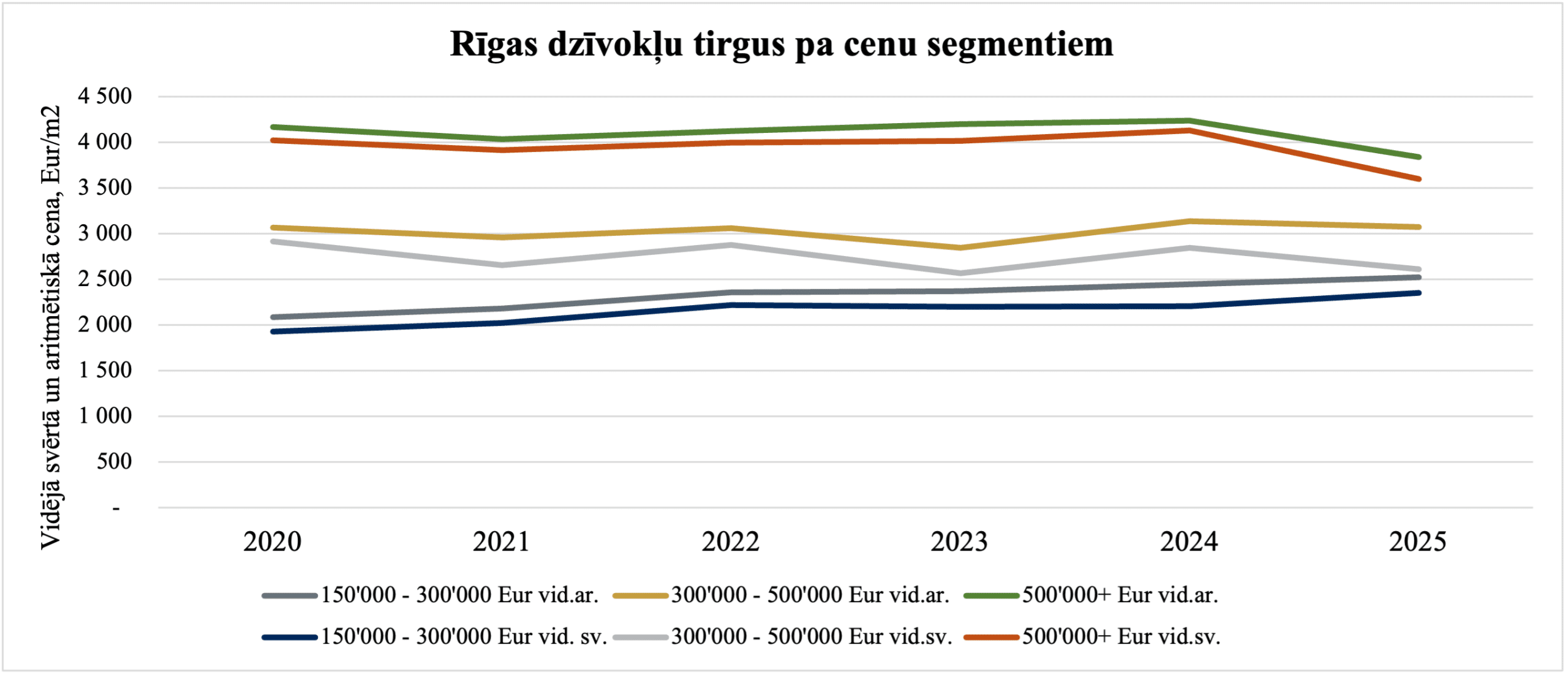 Lielākā aktivitāte turpina koncentrēties cenu segmentā no 150 000 līdz 300 000 eiro, kur darījumu apjoms sasniedza augstāko līmeni analizētajā periodā. Vienlaikus saglabājās stabils pieprasījums arī augstākos cenu segmentos, lai gan darījumu skaits īpašumos ar cenu virs 500 000 eiro bija ievērojami mazāks. Tas apliecina, ka vēljoprojām salīdzinoši nemainīgs ir pircēju loks, kas var atļauties un izvēlas īpašumus virs 300 000 eiro, bet tajā pašā laikā, cenu augšanas ietekmē tieši jaunajos projektos, cilvēki ir vairāk spiesti tērēt virs 150 000 eiro jauna dzīvokļa iegādei. Tomēr vidējā svērtā kvadrātmetra cena pa visiem Rīgas Premium dzīvokļiem 2025. gadā sasniedza 2 424 eiro, saglabājoties salīdzinoši vienādā līmenī ar iepriekšējiem gadiem.