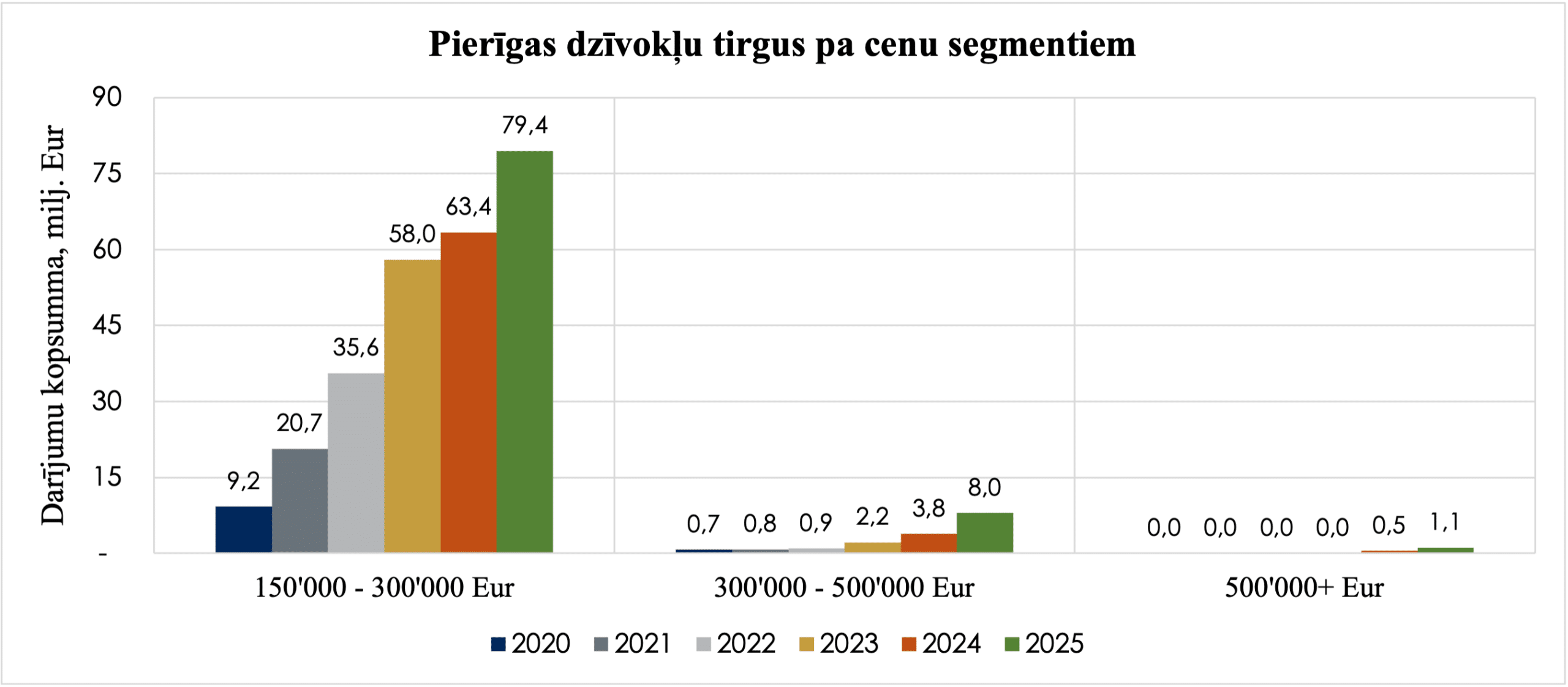 2025. gadā dzīvokļu tirgus Rīgā nostiprinājās kā salīdzinoši dārgs risinājums aktīvai pilsētas dzīvei centrālajās un pieprasītākajās apkaimēs, Pierīgā dominēja ģimenēm piemēroti mājokļi ar lielāku platību un mierīgāku vidi, savukārt Jūrmalā dzīvokļu segments saglabāja nišas raksturu, orientējoties uz augstākās klases un luksusa pircējiem. Dzīvokļi saglabāja savu pozīciju kā pieprasītākais un stabilākais premium nekustamā īpašuma segments Latvijā, veidojot drošu pamatu tirgus attīstībai arī turpmākajos gados.