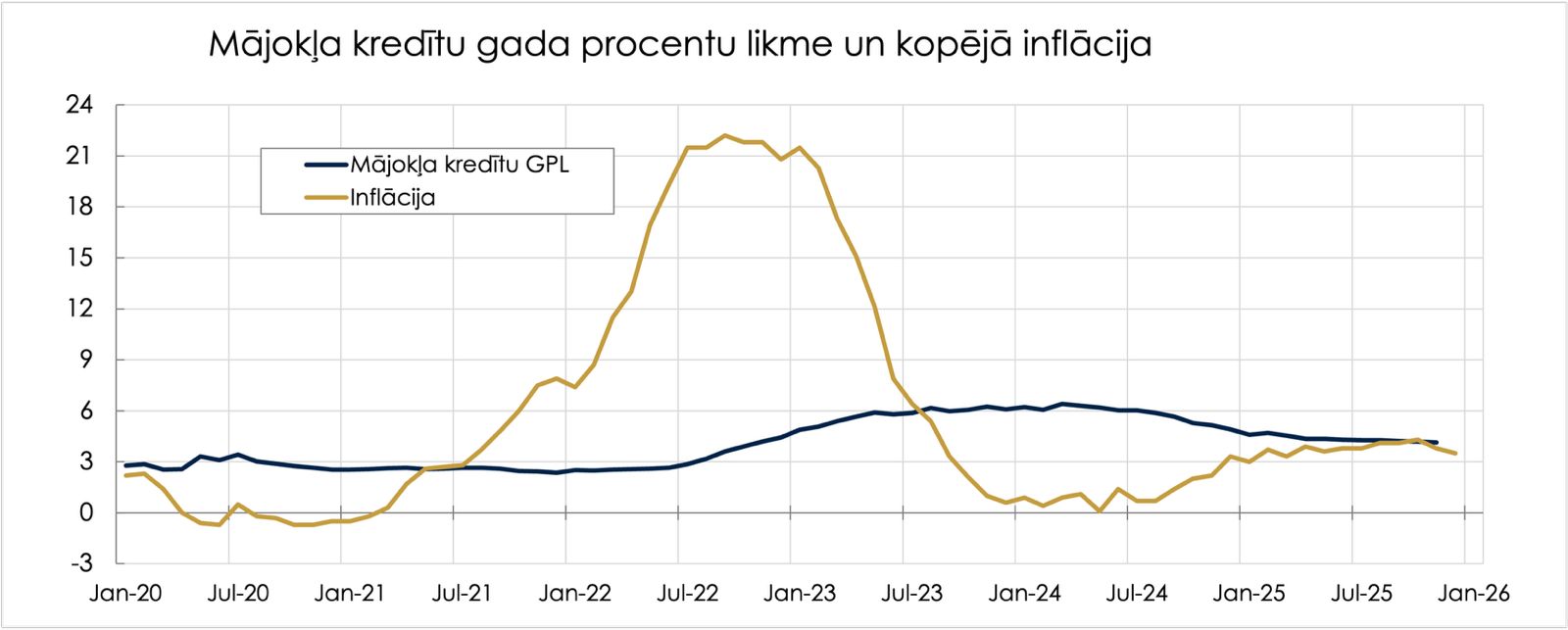 Makroekonomiskā vide 2025. gadā kļuva labvēlīgāka pircēju lēmumu pieņemšanai. Inflācijas rādītāji stabilizējās 3-4% robežās, savukārt mājokļu kredītu gada procentu likmes gada laikā pakāpeniski samazinājās, noslēdzot gadu nedaudz virs 4%. Lai gan finansēšanas izmaksas saglabājās salīdzinoši augstas, procentu likmju lejupslīdes tendence būtiski uzlaboja pircēju noskaņojumu un veicināja iepriekš atlikto darījumu realizāciju.