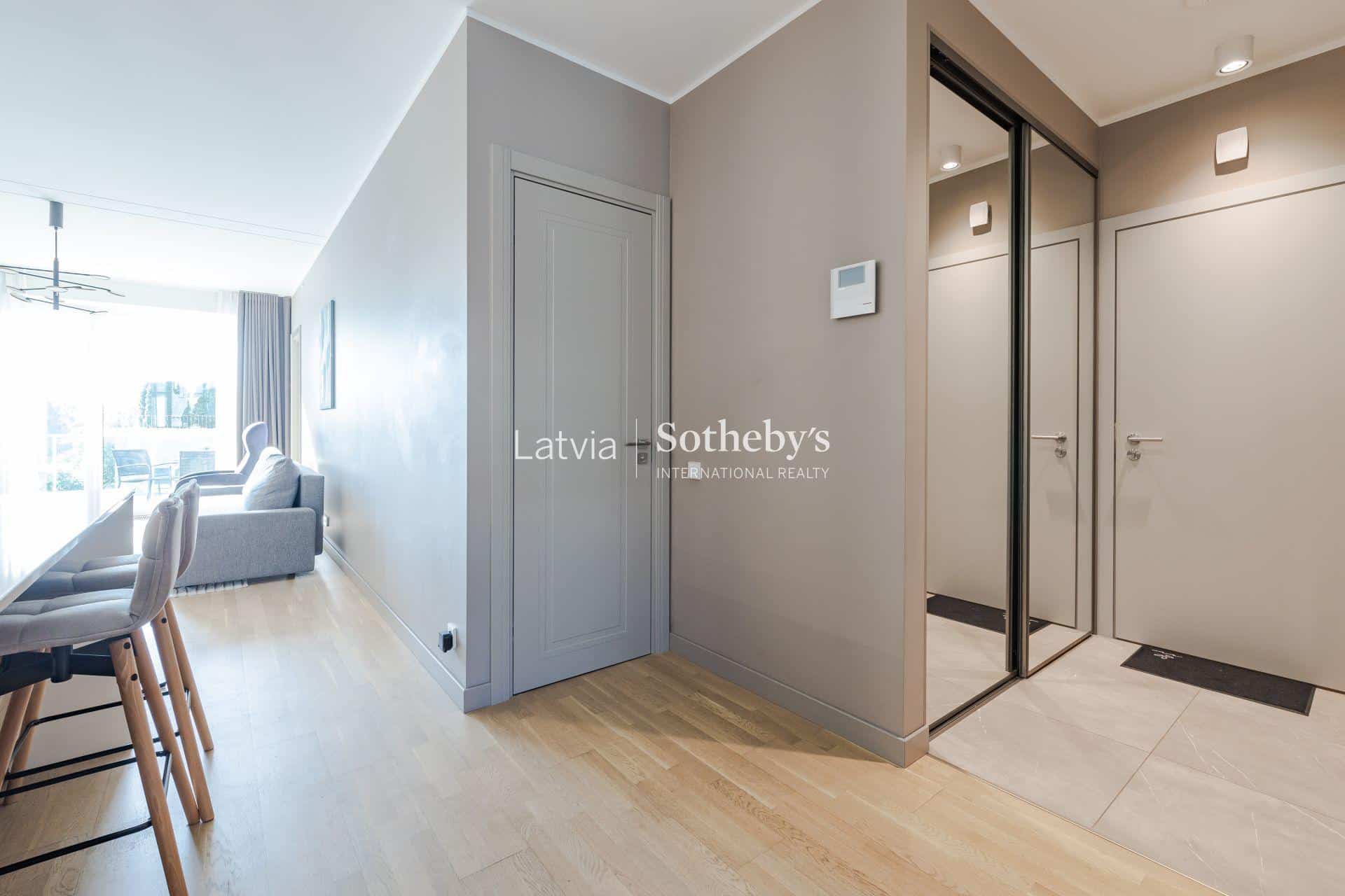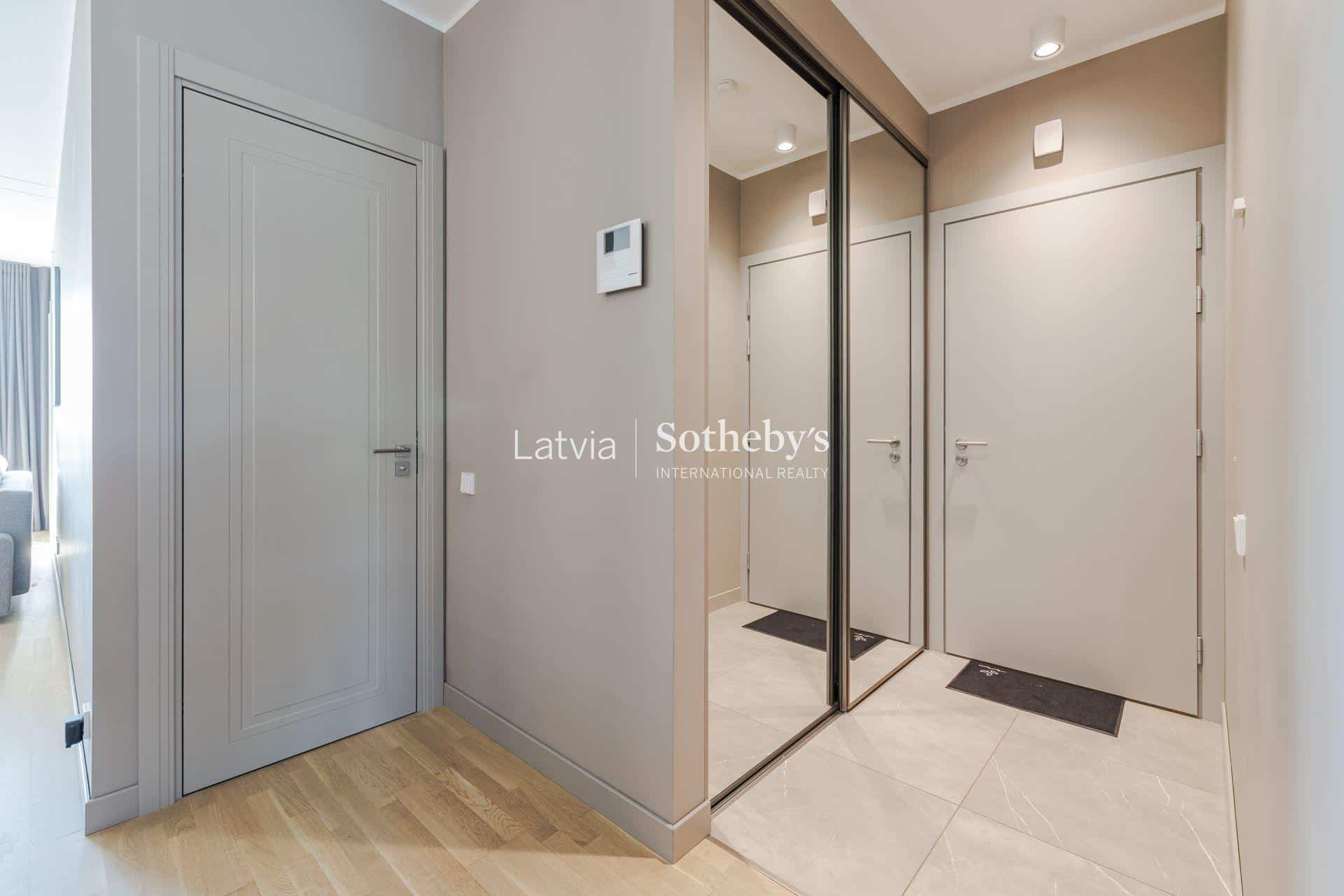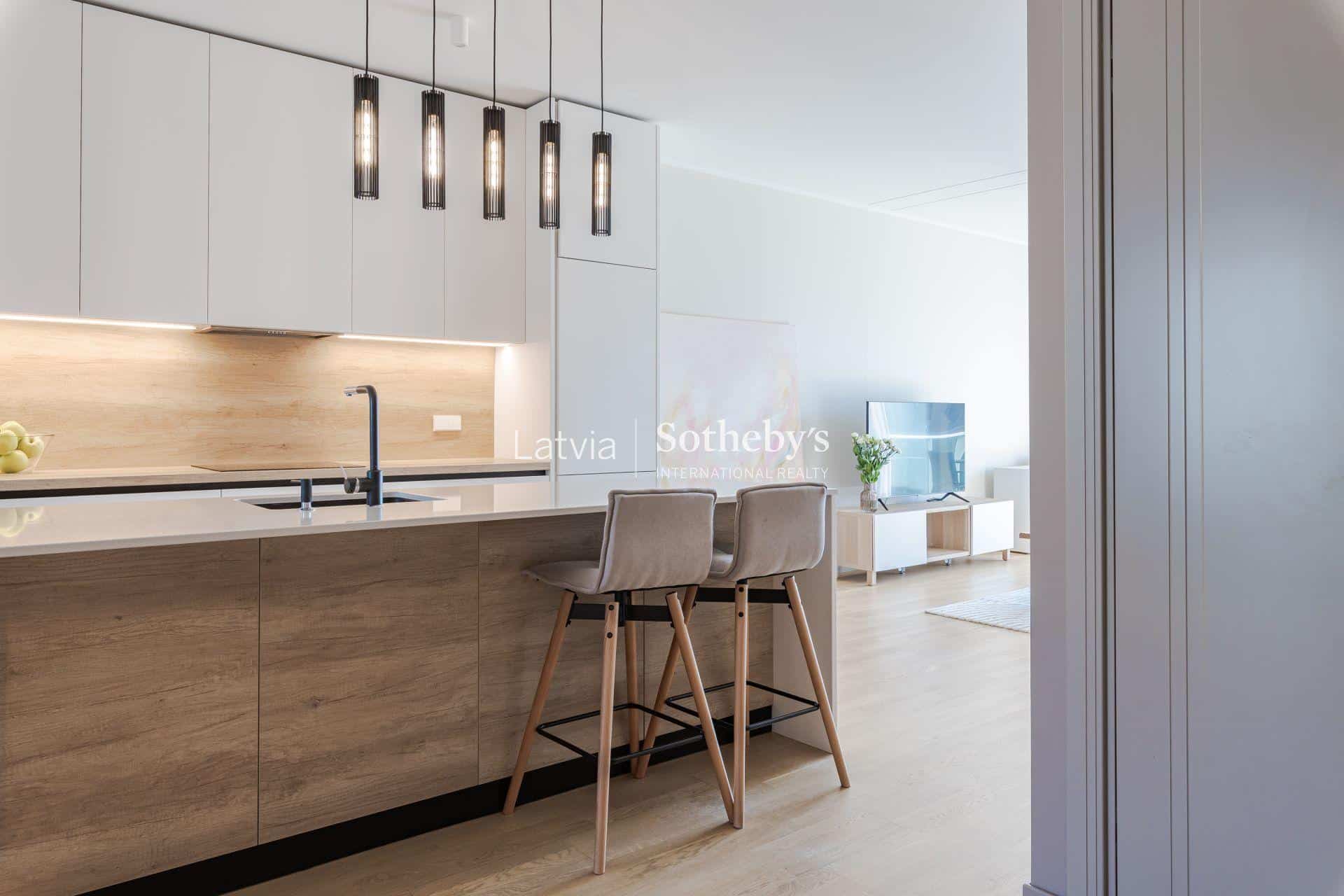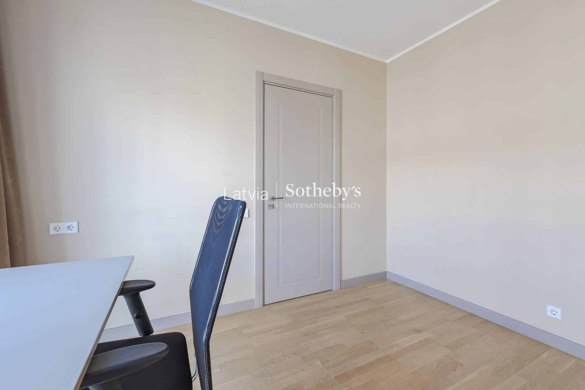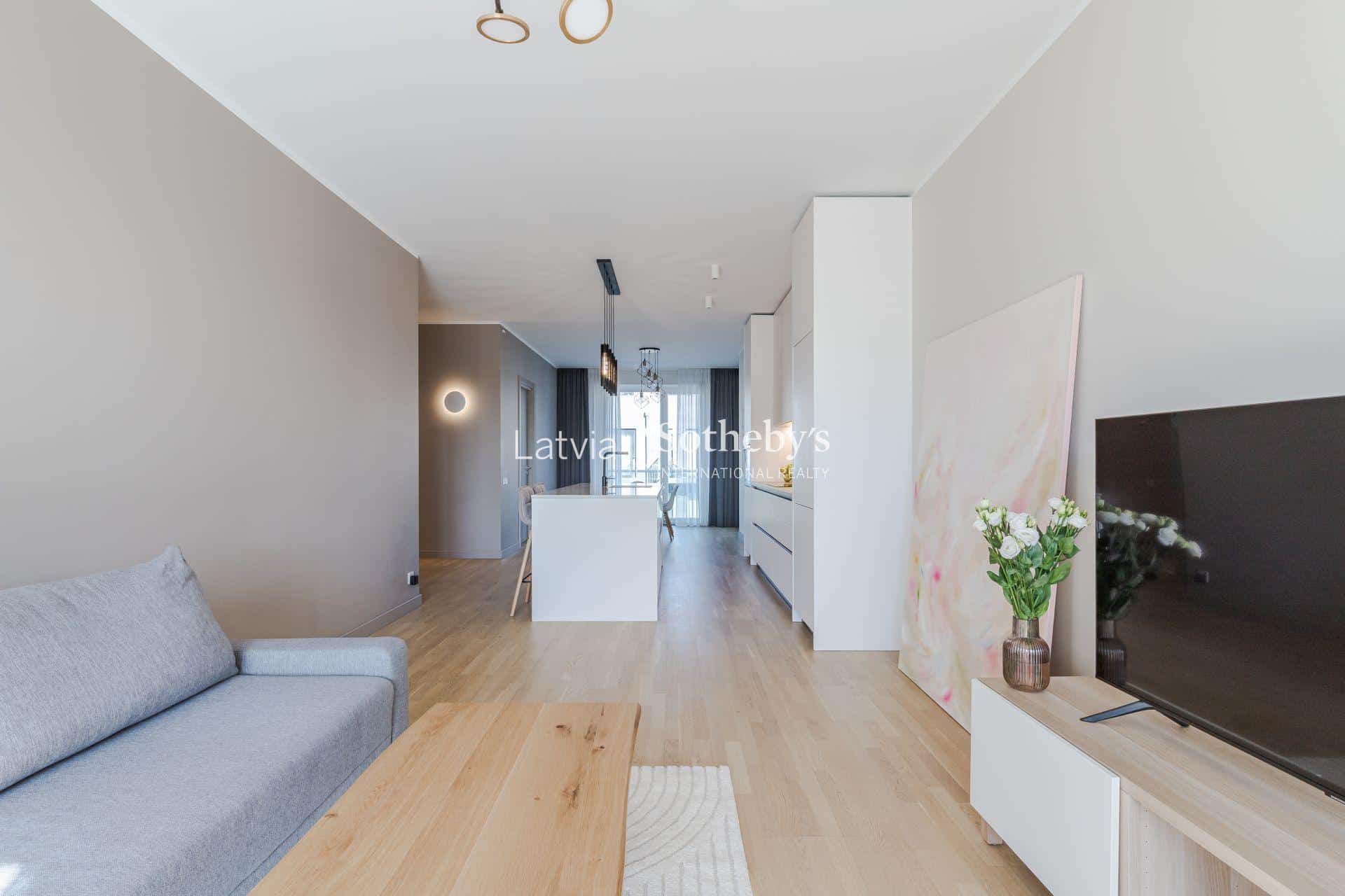 Dzīvoklis ir pilnībā mēbelēts. Tam ir pārdomāts, praktisks plānojums un gaumīgs interjers. Izvēlētā toņu palete rada harmonisku un mājīgu noskaņu. Dzīvokļa plānojums: viesistaba, kas apvienota ar pilnībā aprīkotu virtuves zonu, no viesistabas izeja uz plašu balkonu, guļamistaba, darba kabinets (vai otra guļamistaba), vannasistaba.
