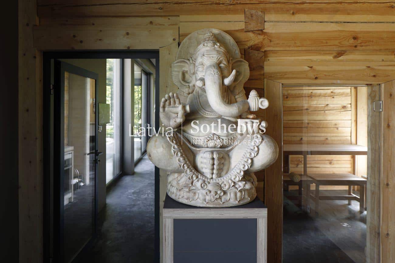 Jogas un darba mājā betona struktūrā iestrādāta guļbaļķu pirts, bet centrālo sienu rotā Garuda Mudra simbols – hindu mitoloģijā pazīstams kā iekšējās brīvības un enerģijas balanss.