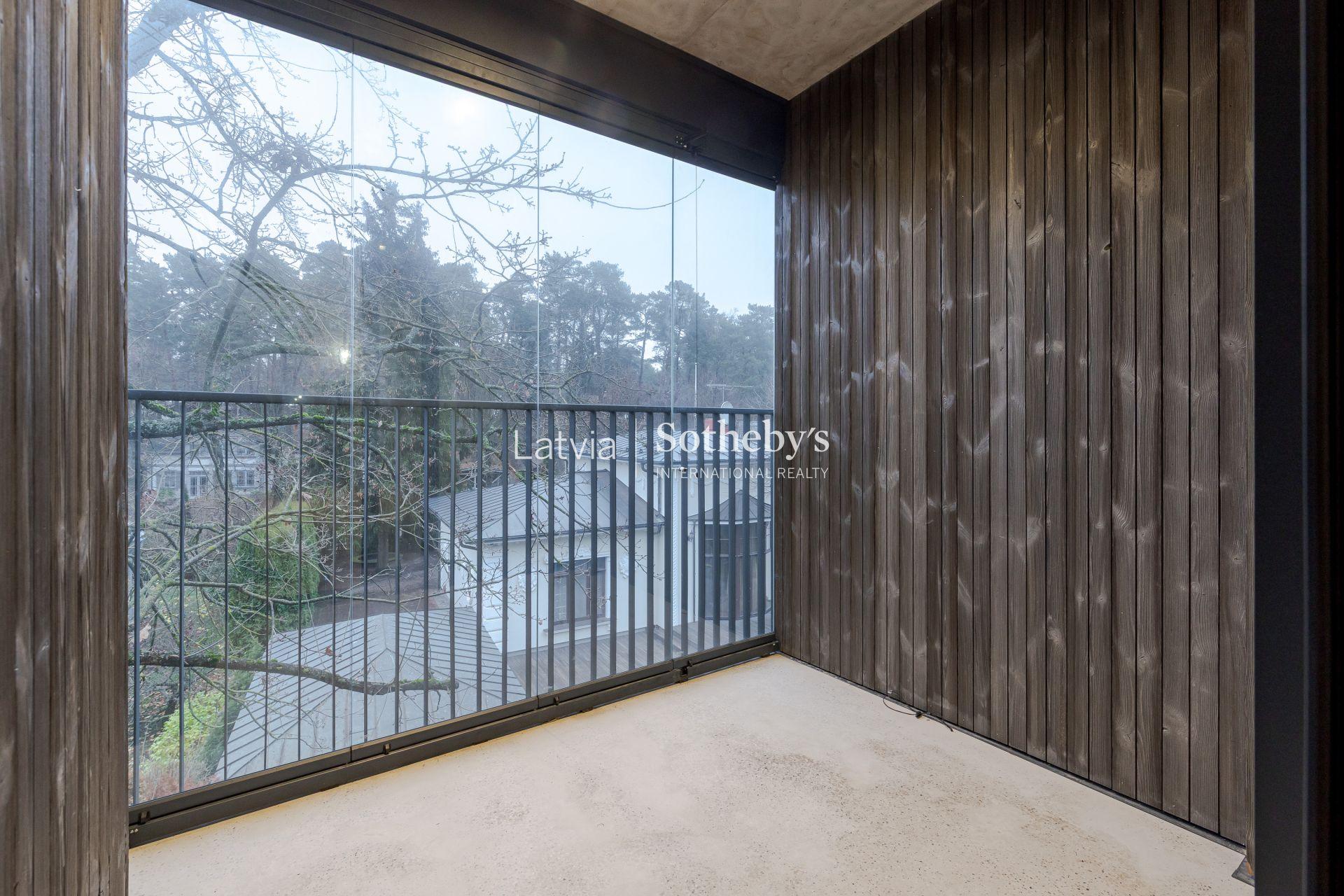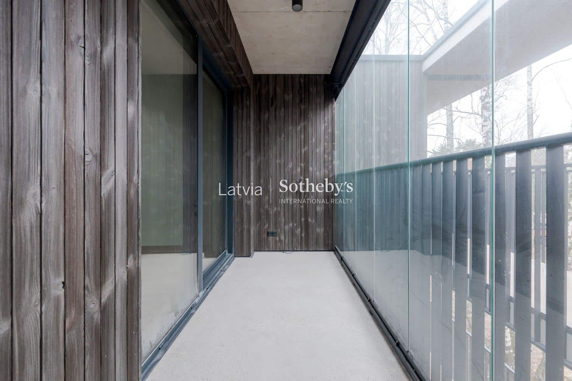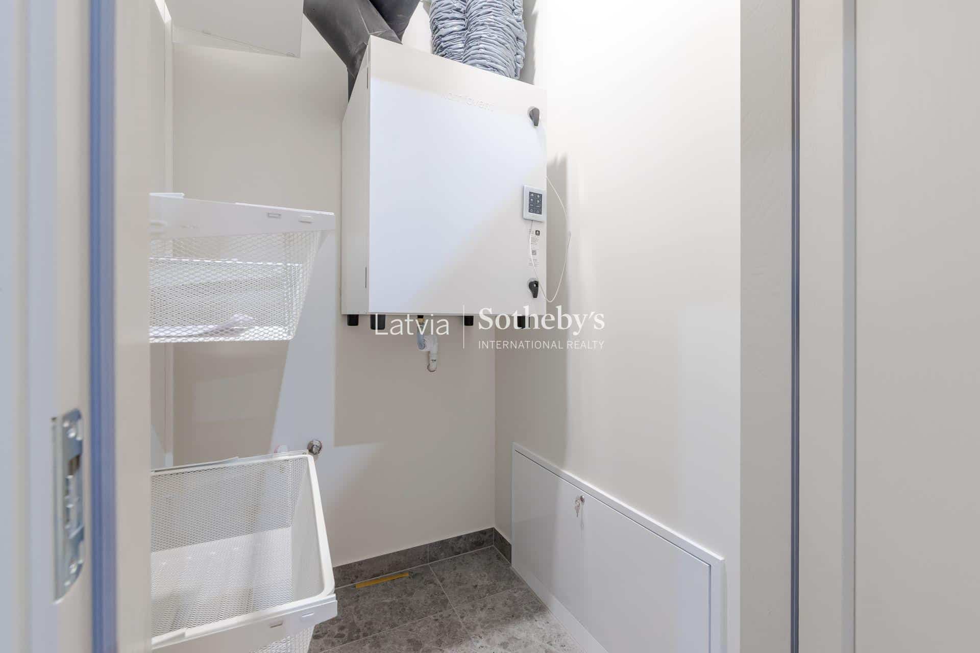 Panorāmas logi paver skatu uz divām debespusēm, nodrošinot dabisku gaismu visas dienas garumā. No vienas no guļamistabām ir izeja uz atsevišķu balkonu. Dzīvoklī ir arī saimniecības telpa veļas mazgāšanai tehnikai un mantu glabāšanai.