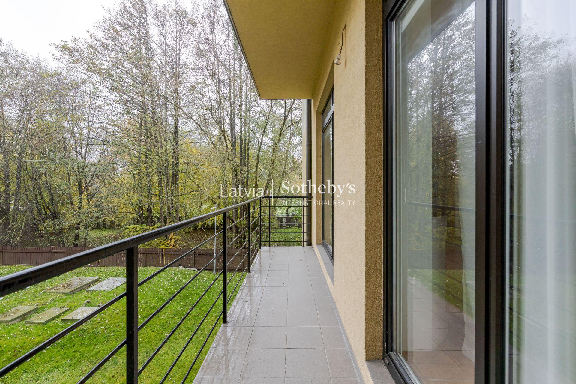 Lieli logi, balkons, teicams plānojums - apkārtnē sakārtoti ceļi, apgaismojums, gājēju celiņi, gājēju pārejas.