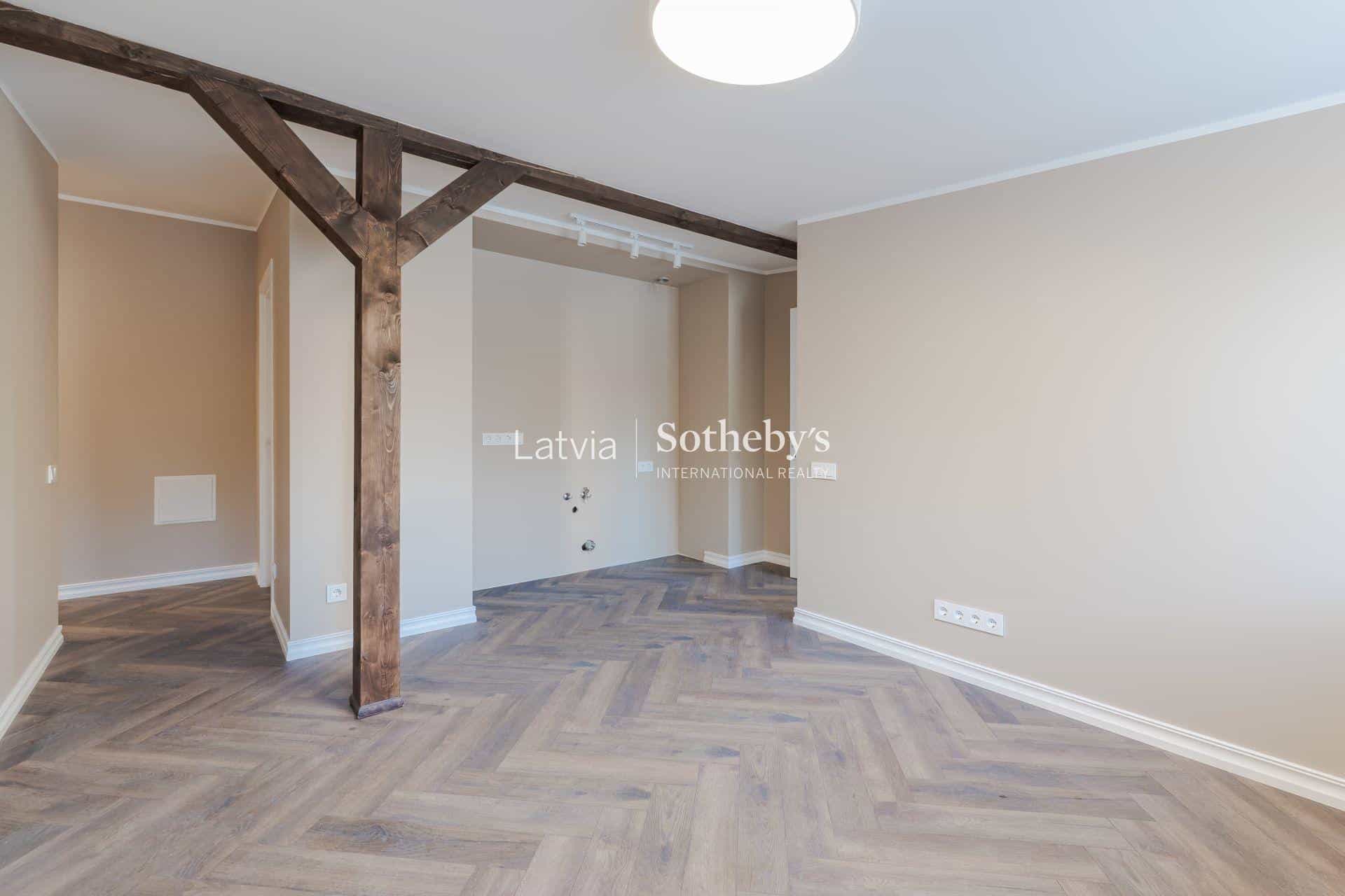 Dzīvojamā istaba organiski apvienota ar virtuves zonu, guļamistaba ir izolēta un ar ērti iekārtotu garderobi. Vannas istabā atrodas tualete un duša, pie ieejas ir funkcionāla priekštelpa.