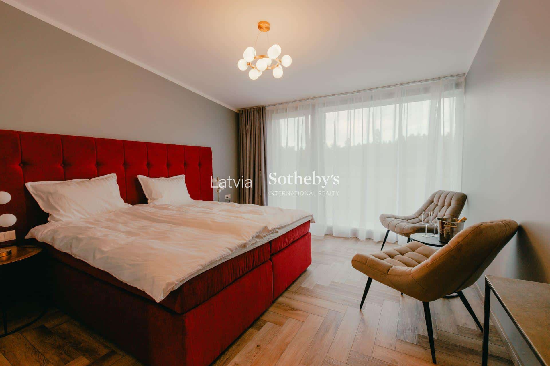 Netālu no dzīvojamās mājas atrodas viesu nams (223 m²), kas pilnībā sagatavots viesu uzņemšanai. Tajā izveidoti pieci numuri ar privātām vannas istabām, profesionāli aprīkota virtuve un veļas telpa. Katrs numurs aprīkots ar kondicionieri, savukārt ēku apsilda siltumsūknis ar siltajām grīdām, kas nodrošina komfortu visa gada garumā. Interjeru papildina gleznu kolekcija, kas piešķir viesu namam savu atmosfēru un raksturu.