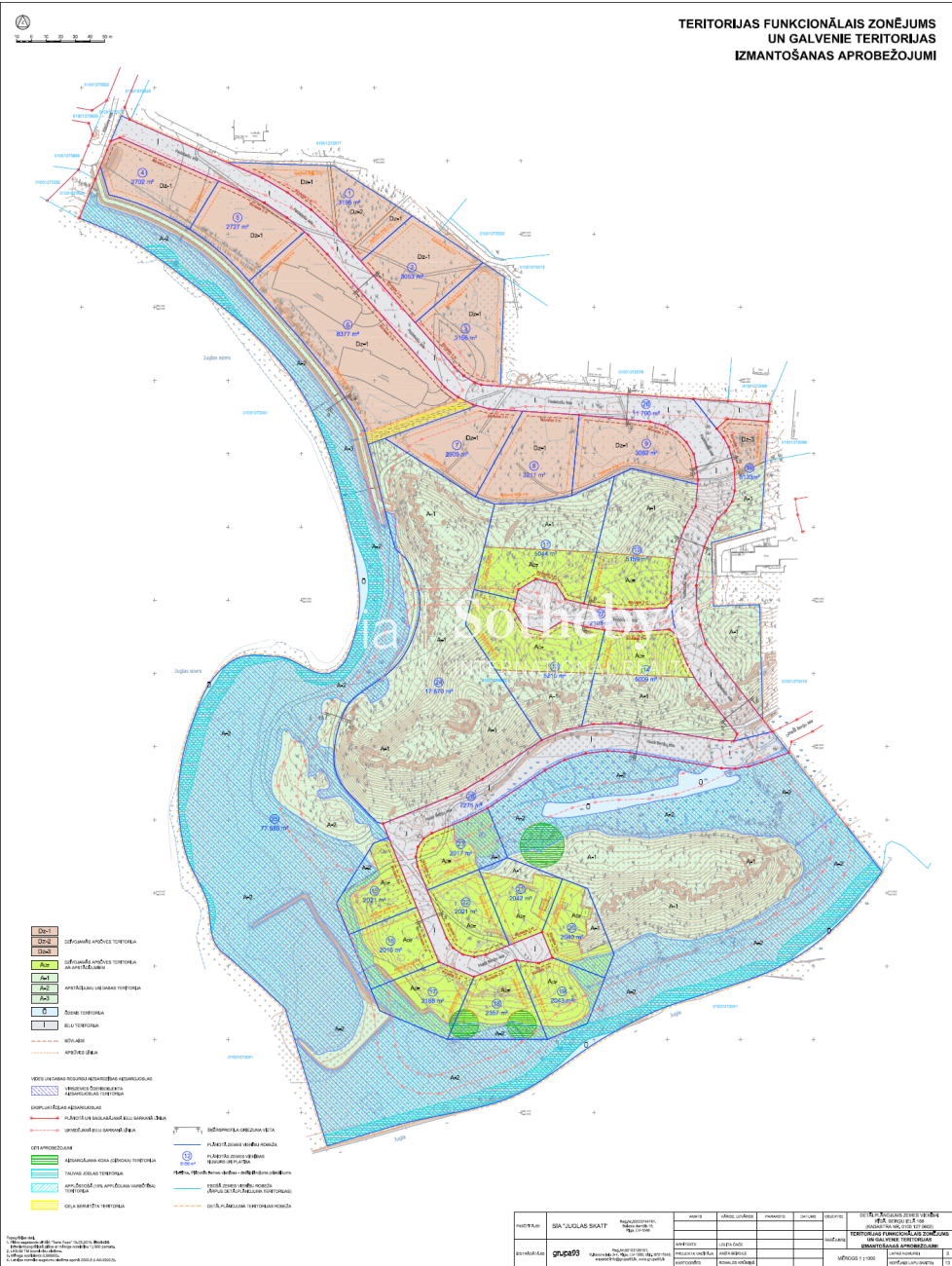 Detālplānojuma zonējums paredz dzīvojamo apbūvi (Dz) un dzīvojamo apbūvi ar apstādījumiem (ADz), plašas apstādījumu zonas (mežs/krastmala), ielu un nelielu ūdeņu teritoriju; ADz zonā pieļaujama savrupmāju, dvīņu un rindu māju, daudzdzīvokļu namu un pirmsskolas iestādes izbūve, kā arī vietējas nozīmes pakalpojumi, sporta un ārstniecības funkcija. Apstādījumu teritorijās iespējami rekreācijas risinājumi (piem., laipas/skatu punkti) un piestātņu sauszemes infrastruktūra.