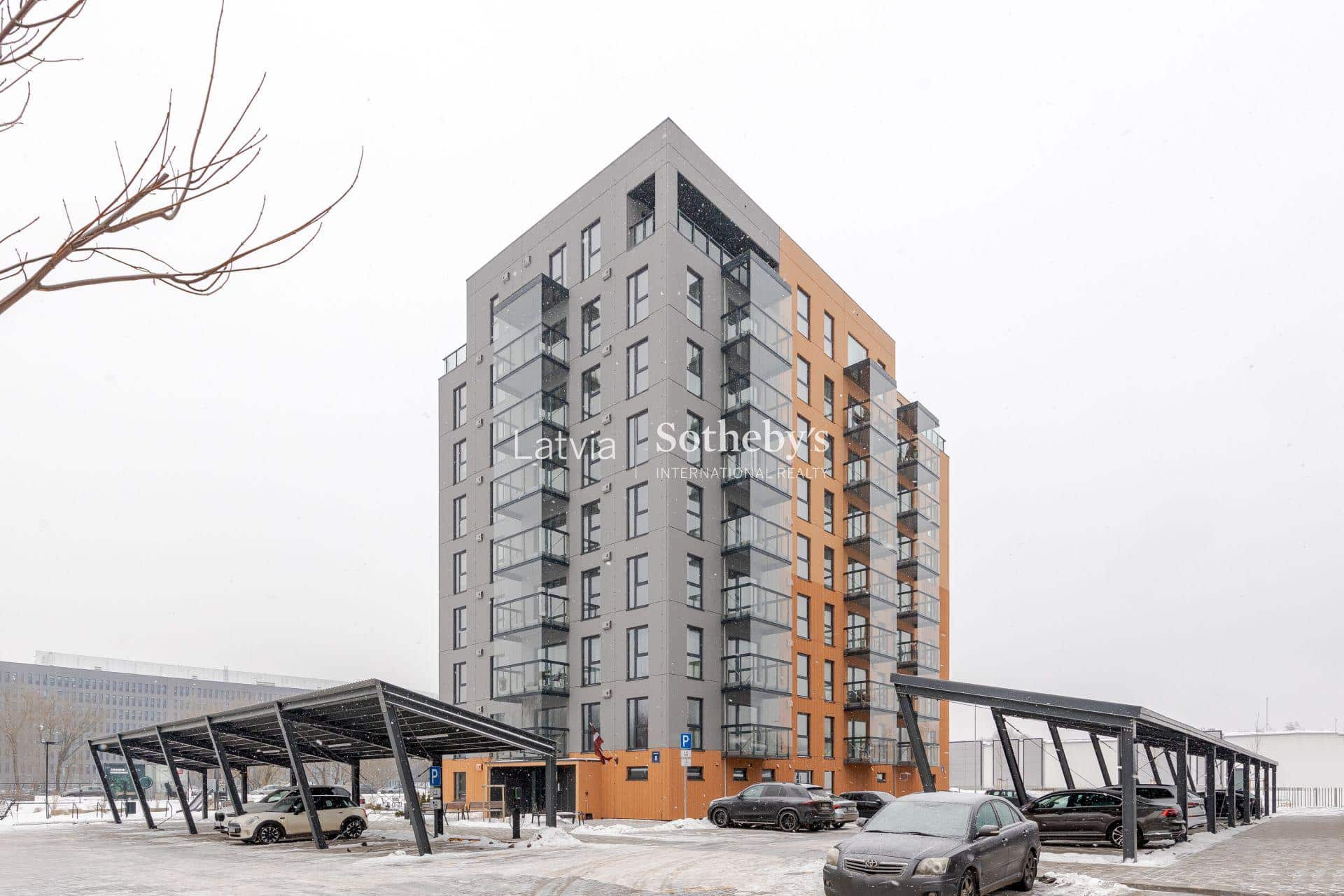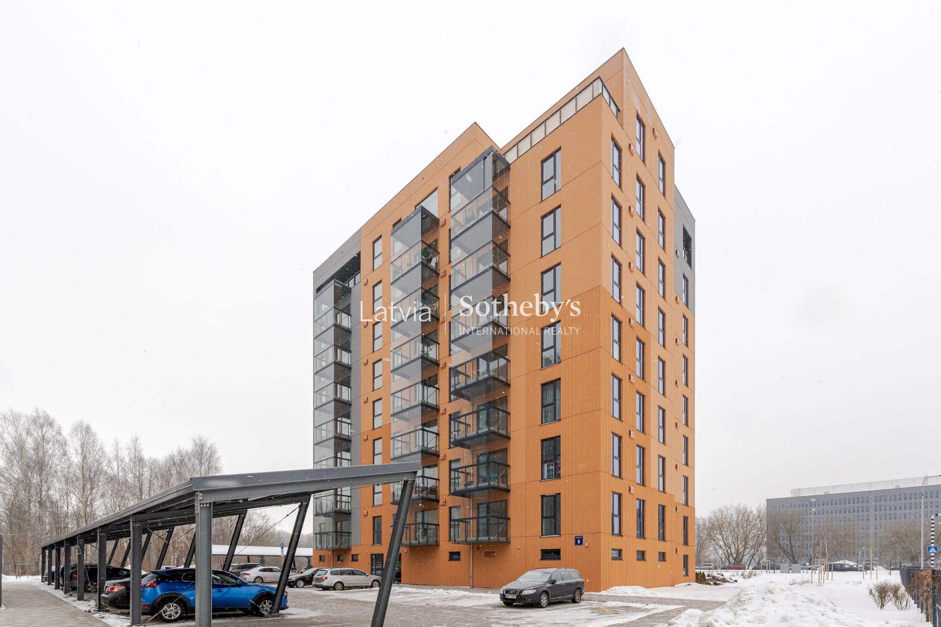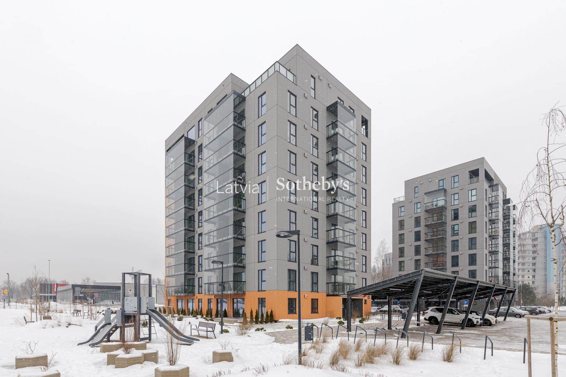 В огороженном дворе здания расположены парковочные места и велопарковки под навесами, детская площадка, тренажеры и зеленая зона.