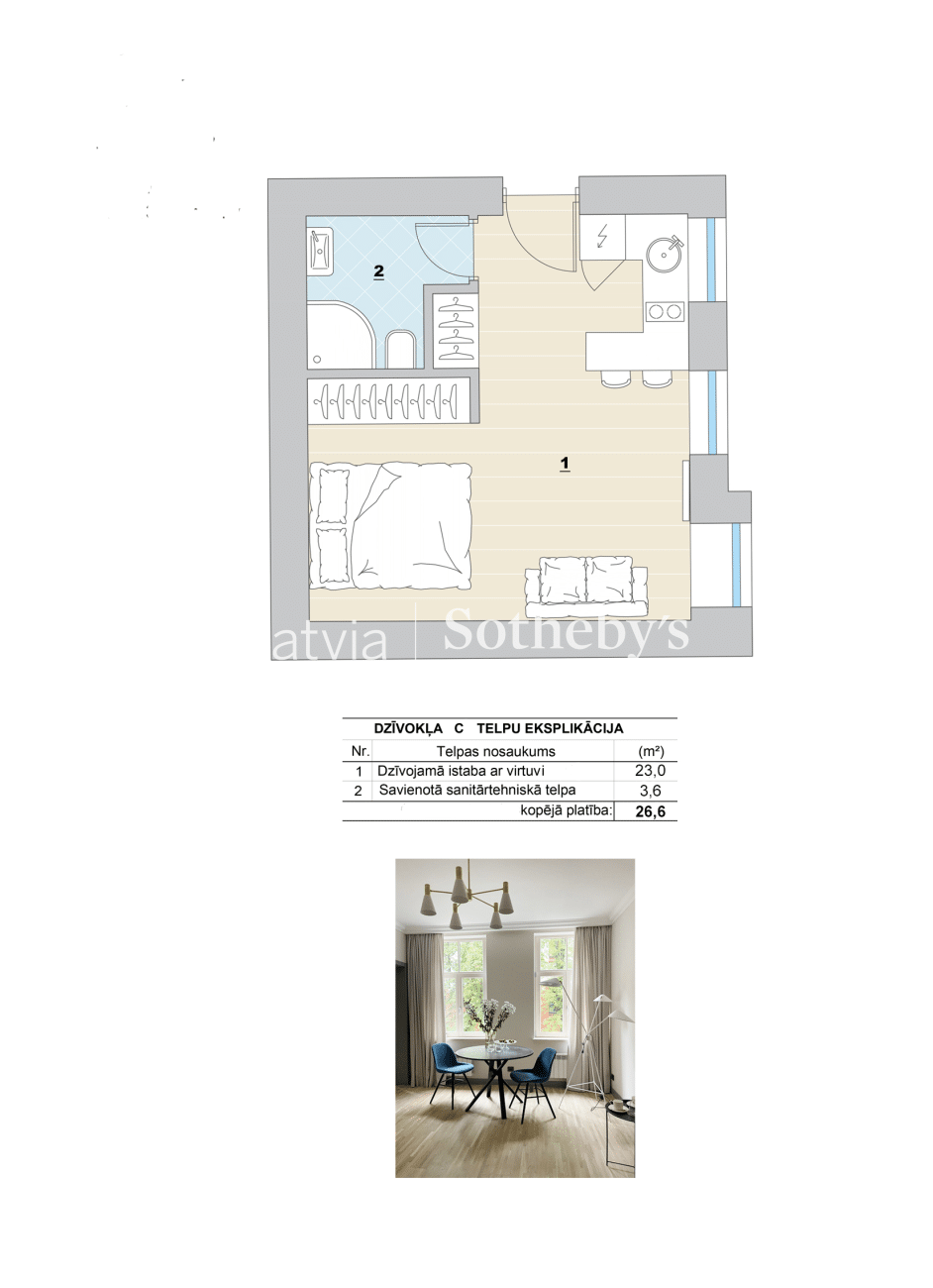 Планировка предусматривает студию, совмещённую с кухонной зоной, и одну ванную комнату с душем. В интерьере квартиры выбраны нейтральные, но современные тона и использованы качественные отделочные материалы. Во всей квартире установлены тёплые полы.