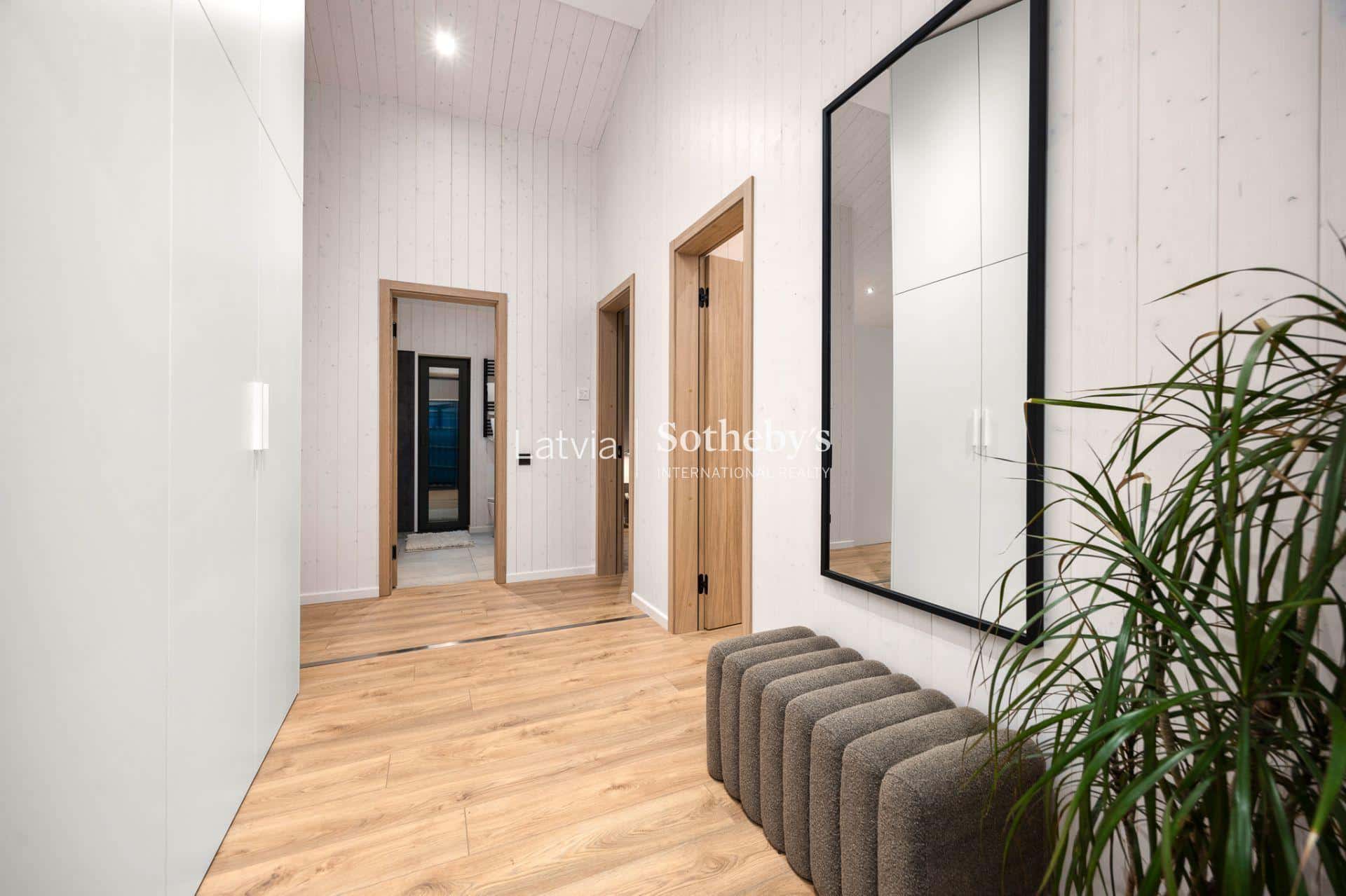 Интерьер выполнен из натуральных материалов, качественные полы (класс MAMMUT 33, натуральный дуб), межкомнатные двери с дубовым шпоном и черной фурнитурой.