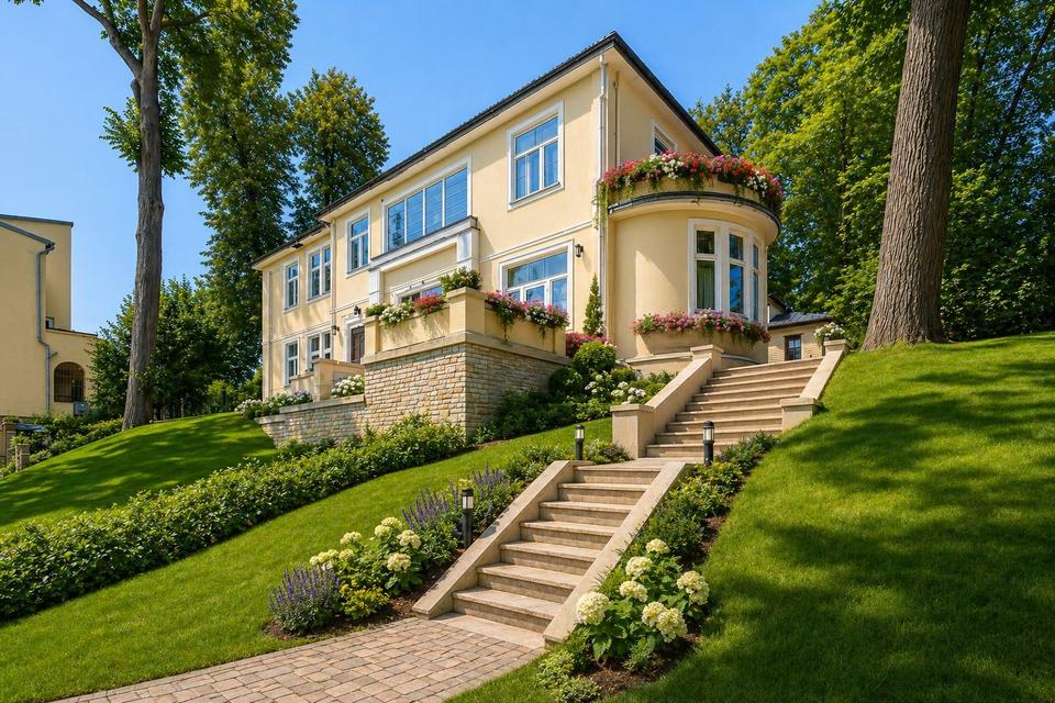 Plaša savrupmāja zaļā piepilsētas ciematā
